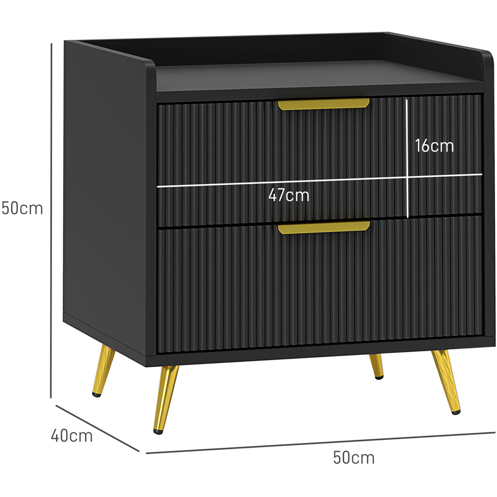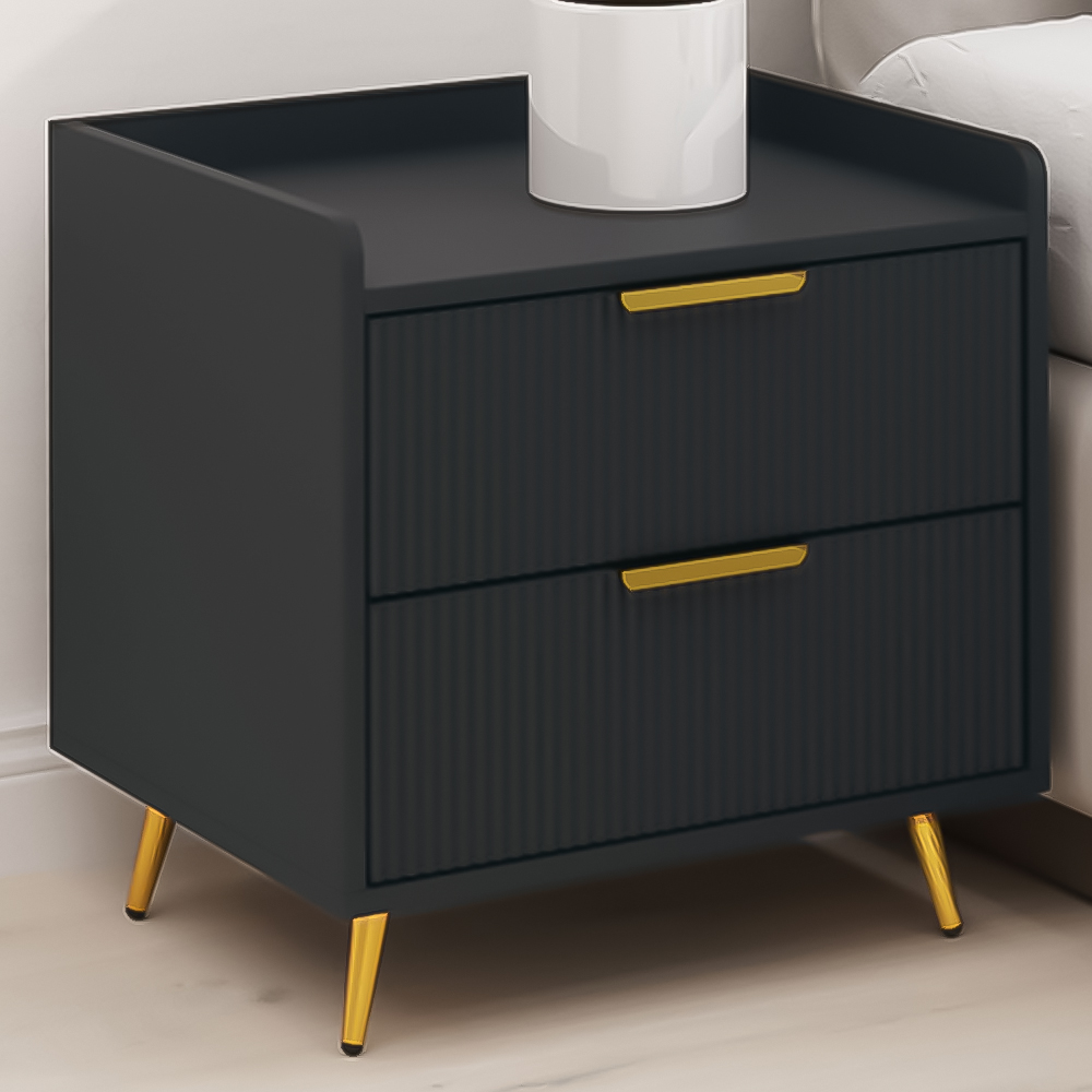 Elevate your living space with the stylish Portland Bedside Table. Featuring ridged drawer fronts and elegant gold-tone handles, this bedside table brings a beautiful accent to its solid colour design. It offers two spacious drawers and a flat tabletop with safe low-rise walls, providing ample storage for bedtime essentials and more. Additionally, the metal legs ensure strong support and stability.