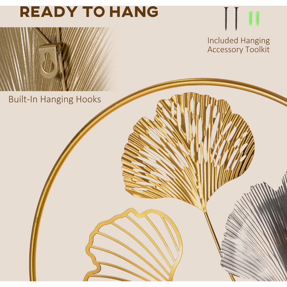 Elevate your space with the captivating artistry of the 3D Gold Metal Ginkgo Leaves Wall Art. This stunning piece, crafted from durable metal, features a distinctive two-circle design embellished with intricately cut-out flowers, hand-painted in rich metallic hues. The muted metallic tones and floral shapes combine to create a mesmerizing visual effect within the round frame. Effortlessly enhance your home's aesthetic with this elegant addition, simply attach the outer frame using the included hanging hooks and kit. Let your walls reflect your unique style and create a statement in any room.