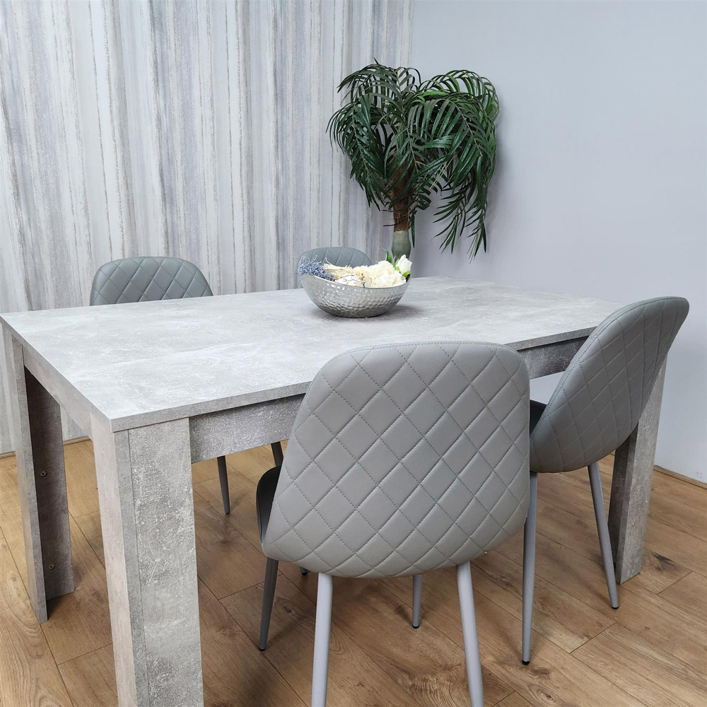 Elevate your dining experience with the Portland Four Seater Dining Set. The table showcases a sophisticated stone-grey effect, thanks to its high-quality MDF construction and melamine laminated finish. This set comes complete with four grey chairs, each upholstered in premium leather, offering a supremely comfortable seating experience. The dining chairs are distinguished by their elegant diamond-stitched pattern and supported by sleek, tapered metal legs, ensuring stability and support. Adjustable foot protectors on the metal legs prevent any damage to your flooring. With its understated design, this dining set effortlessly complements a variety of interior styles. It also comes conveniently packaged with easy-to-follow assembly instructions. Table dimensions: 140 x 80 x 75cm. Chair dimensions: 52 x 44 x 85cm, with a seat height of 44cm.