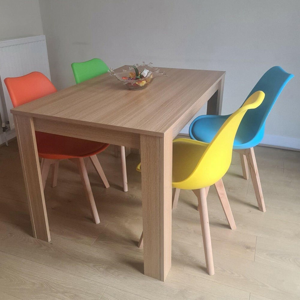 Elevate your dining space with the Portland 4 Seater Square Dining Table Set. This ensemble includes a stylish table and four coordinating chairs, perfect for modern living. The table showcases a light oak natural wood grain finish, achieved with high-quality MDF and melamine lamination, ensuring lasting appeal and long-lasting use. Complementing the table are tulip chairs, crafted from premium plastic with sturdy wooden legs, promising a durable structure and a comfortable seating experience. The leather chairs, available in multiple colours, feature a gently curved back designed to support the body's natural shape. Adjustable feet protect your floors from damage. Easy to assemble with clear instructions. Dimensions: Table- H75 x W77 x L117cm. Chair- H83 x W77 x L117cm. Bench- H45 x W30 x L90cm. Seat height- 44cm.