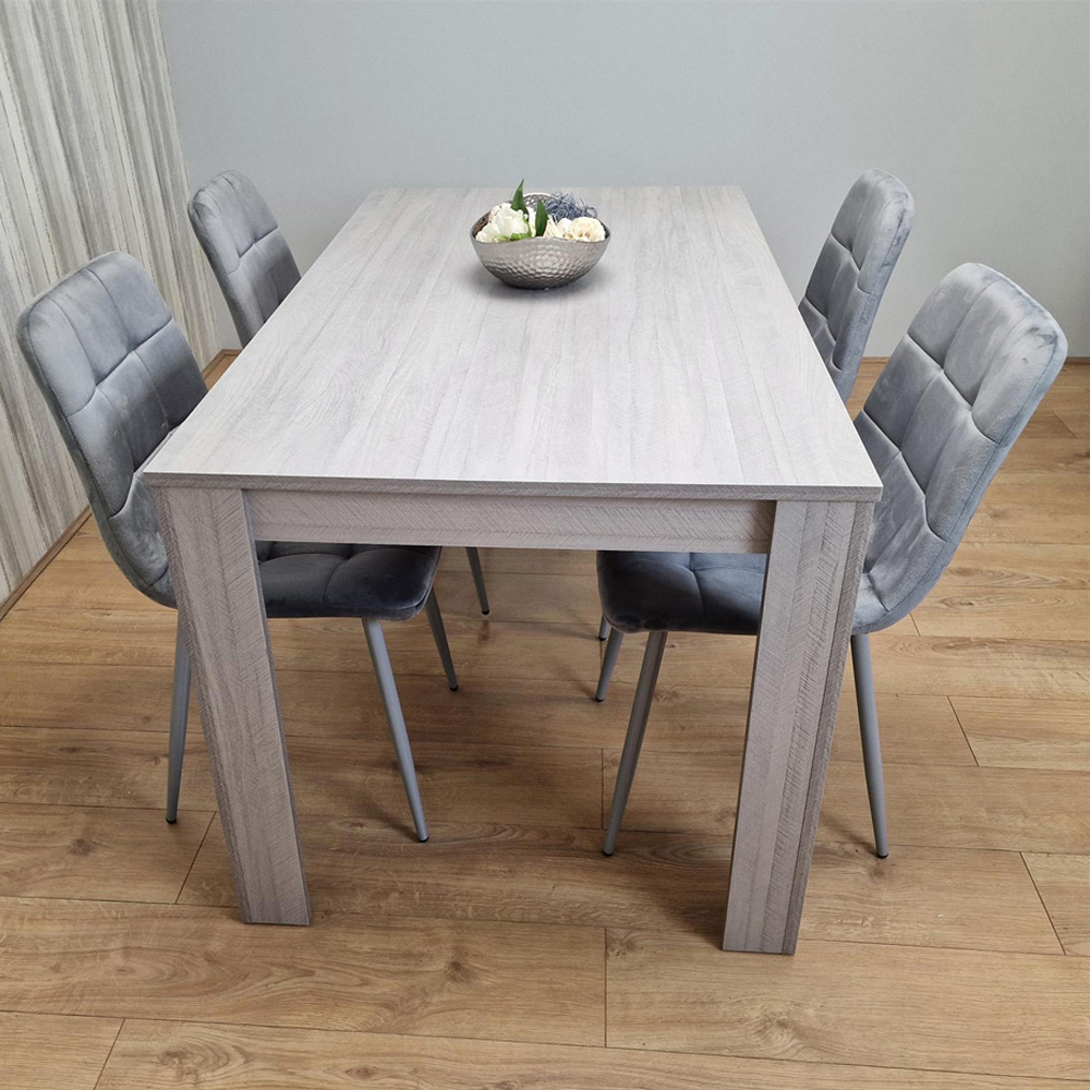 Introduce a touch of elegance to your dining area with the Portland 4 Seater Velvet Dining Set in Grey. This exquisite set features a wooden arrow grey dining table, accompanied by four tufted velvet grey Rocco chairs. The table boasts a high-quality MDF construction with a melamine laminated finish, ensuring a resilient and enduring surface.