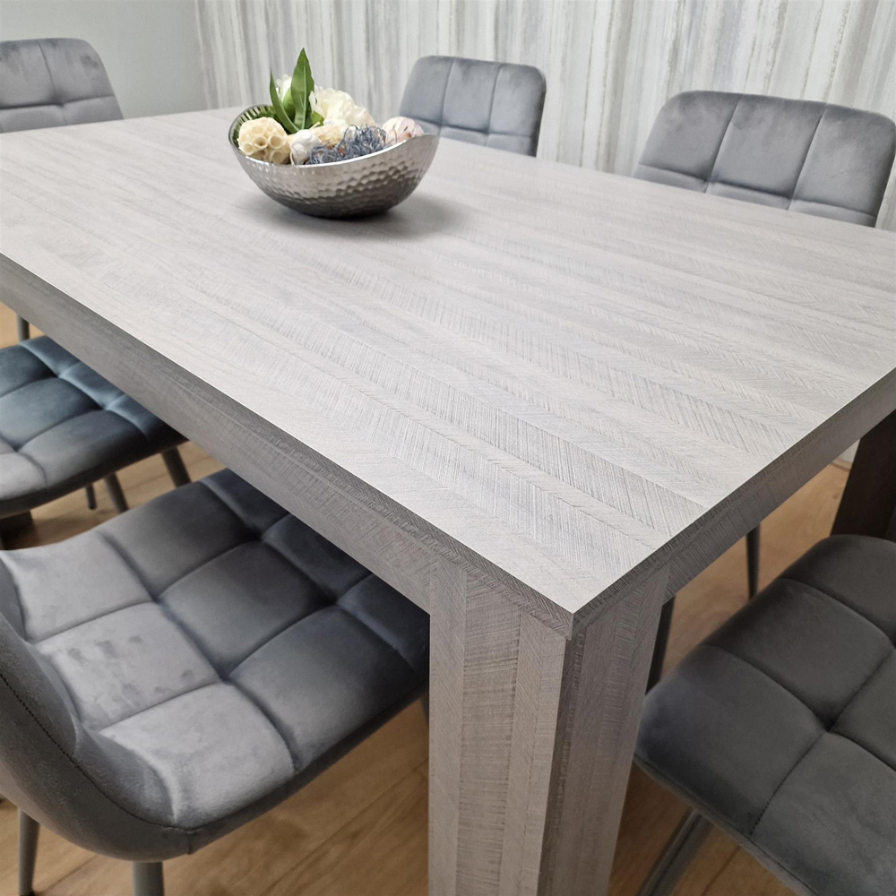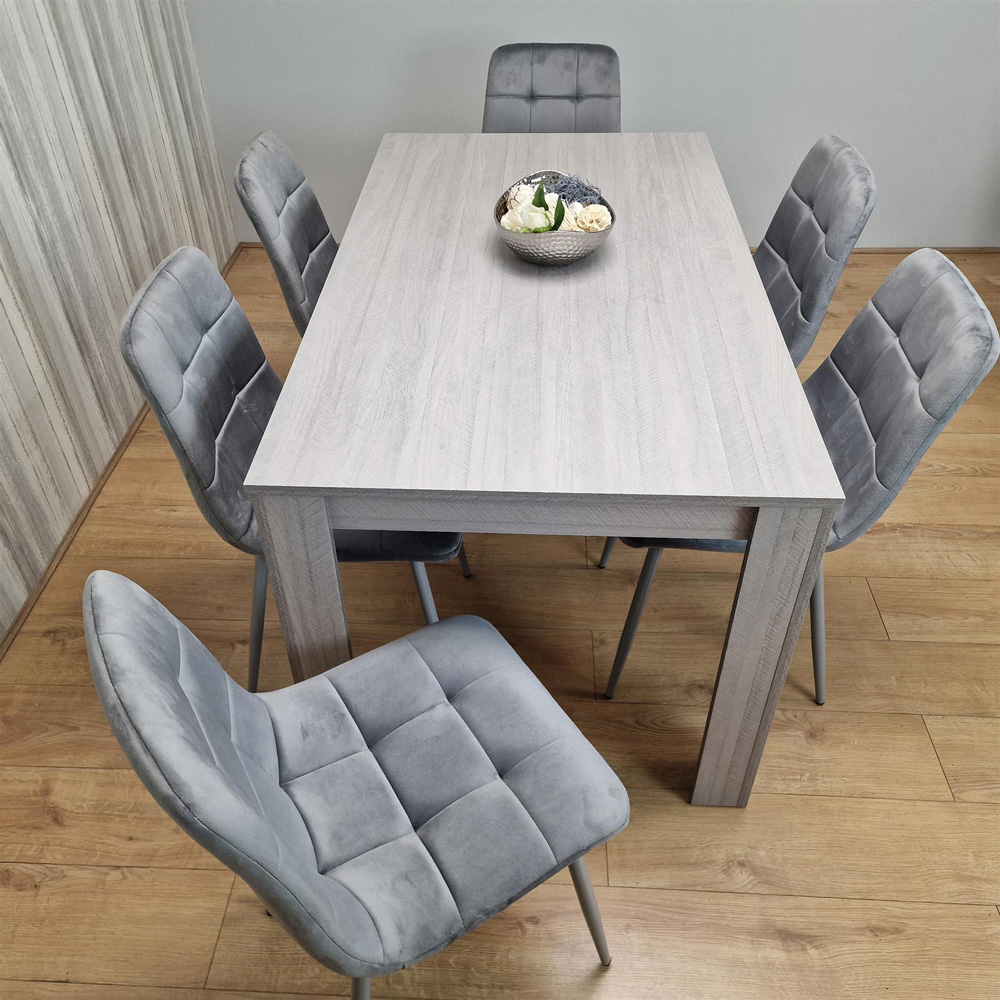 Introduce a touch of elegance to your dining area with the Portland 6 Seater Velvet Dining Set in Grey. This exquisite set features a wooden arrow grey dining table, perfectly complemented by six tufted velvet grey Rocco chairs.