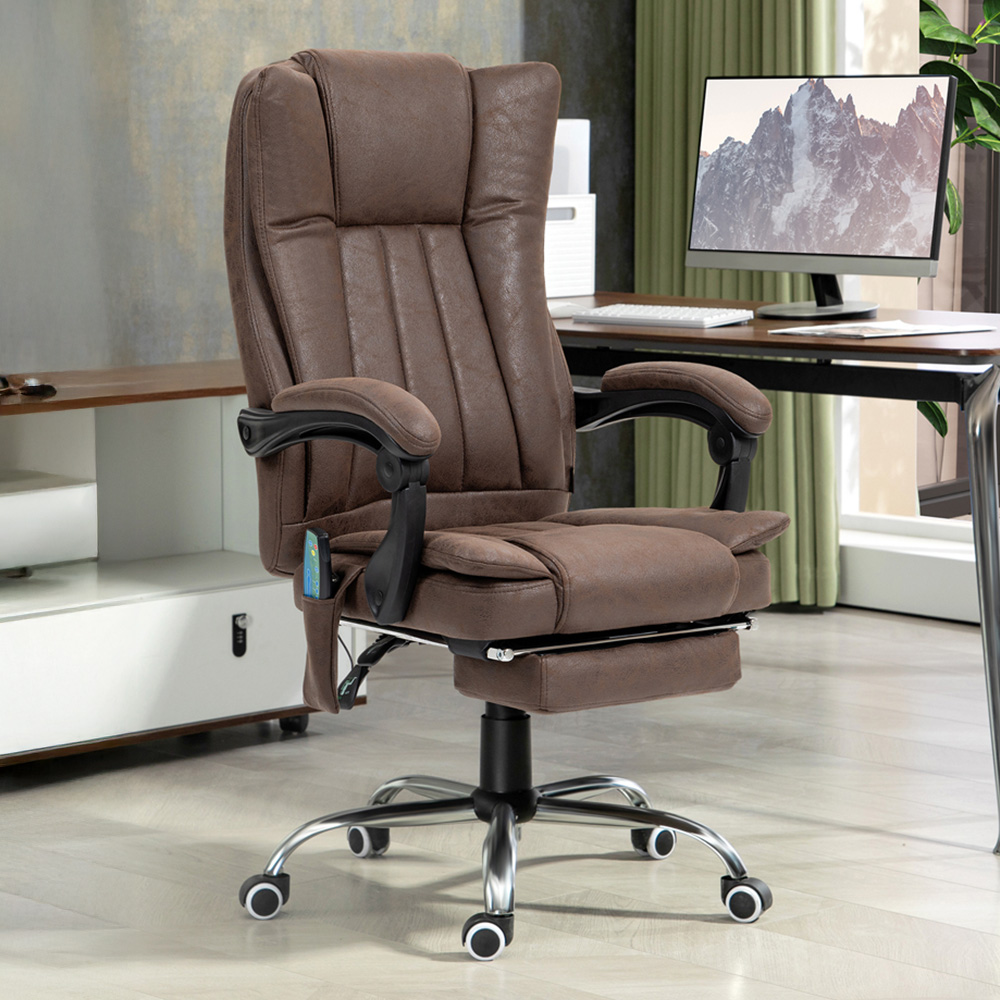 Make long working hours more comfortable and less tiring Portland Brown Microfibre Upholstery Vibrating Heat Massage Chair. It features six massage points with a heating function to help relax the body during extended periods of sitting. The chair is upholstered in soft microfibre fabric and filled with thick padding for a plush feel. It includes a reclining backrest and a manual footrest for added relaxation. The seat height is adjustable to suit different desk levels, and the fixed armrests and high back provide additional support. Five caster wheels at the base allow for smooth and easy movement around the workspace.