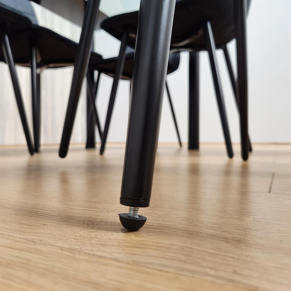 Crafted with an 8mm tempered glass surface and supported by robust metal legs, this dining table ensures lasting durability and a long-lasting tabletop. The chairs are upholstered in luxurious velvet, complemented by metal legs, providing both style and resilience. Adjustable foot protectors on the chair legs prevent floor damage.