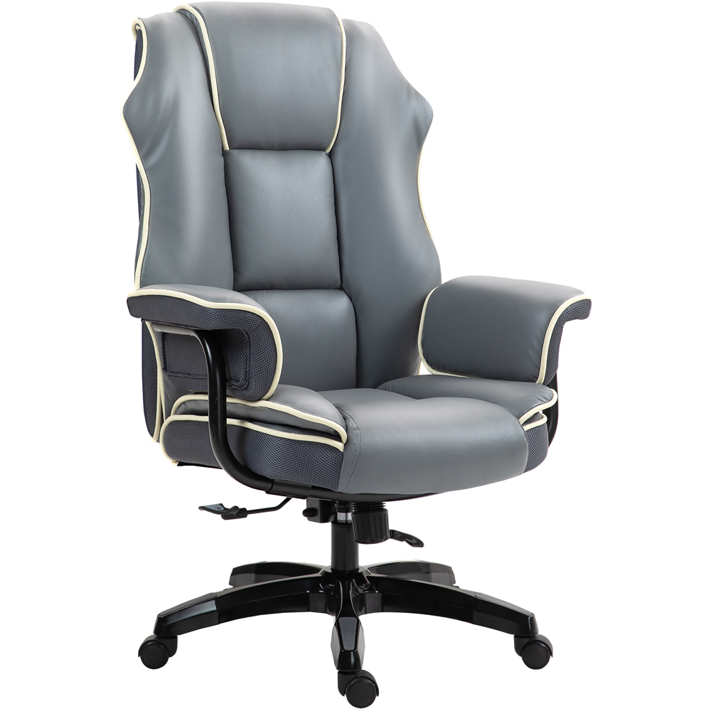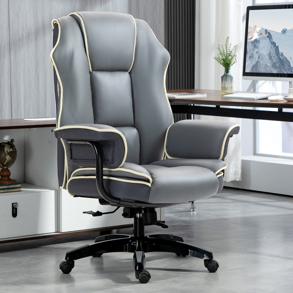 Experience comfort in style with Portland Grey Height Adjustable and Reclining High Back Office Chair. This chair is wrapped in smooth faux leather upholstery and is thickly padded to ensure your utmost comfort. The white piping on the edges offers a striking contrast and it comes with a 150° reclining back so you can relax back whenever you need. It includes five wheels for you to move around easily and comes with the height is adjustable between 50-56cm.