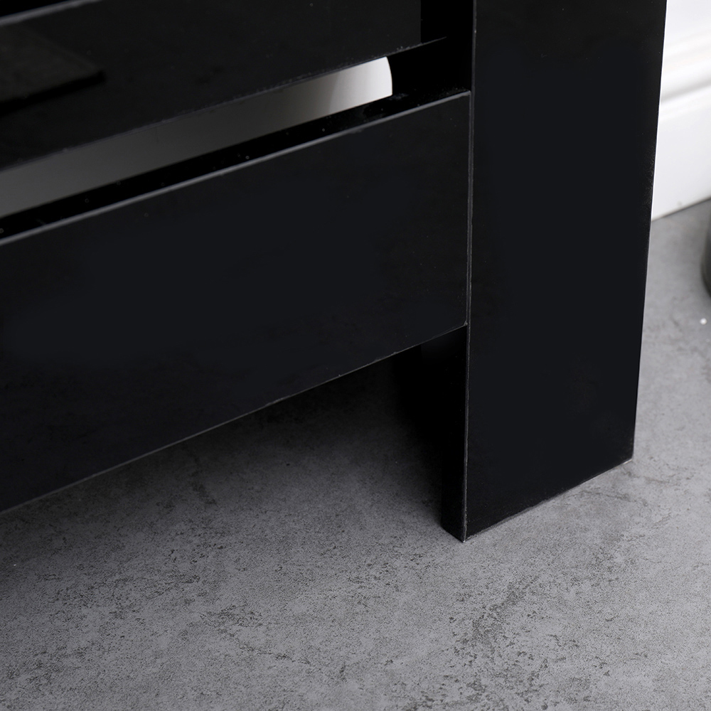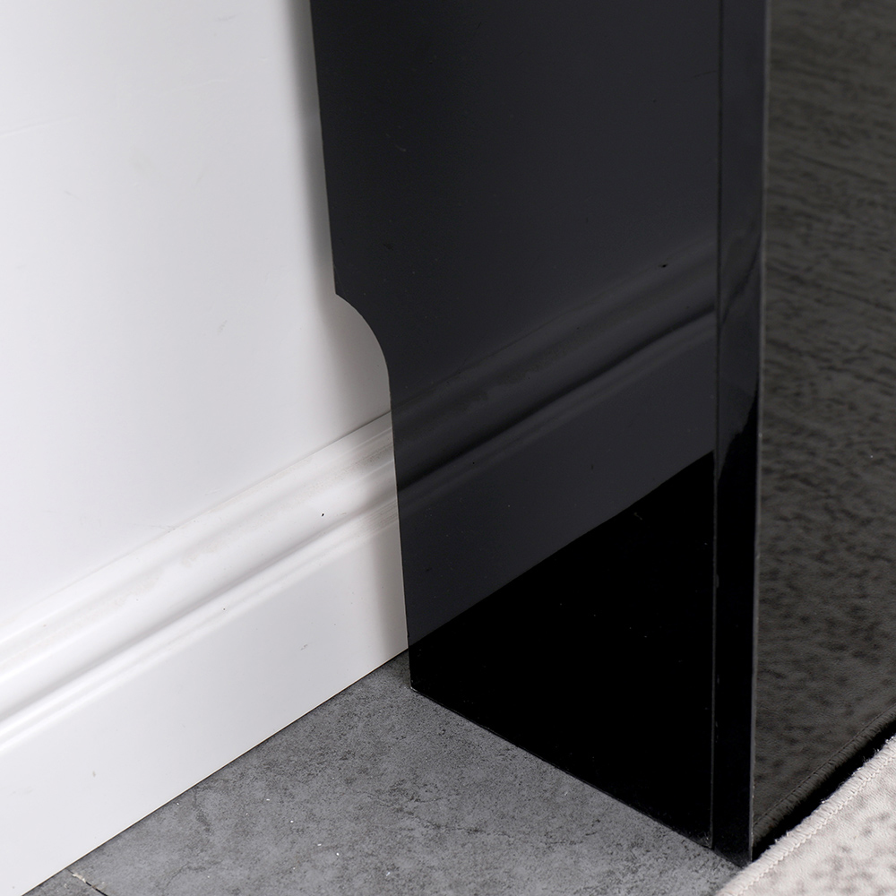 This stylish radiator cover, in a sleek high-gloss black finish, is the perfect blend of form and function. More than just a cover for an outdated radiator, it’s a statement piece that elevates your room's décor. The generous top surface provides ample space to display photos, plants, or other cherished items, adding a personal touch to your interior design. Secure wall mounting ensures stability, while a cleverly designed skirting board cutout allows for a seamless fit over most standard boards. Crafted from chipboard with a durable, wipe-clean high-gloss UV surface, this cover offers both beauty and practicality. External dimensions are 151.5cm (W) x 19cm (D) x 82cm (H), with internal dimensions of 146.5cm (W) x 16.5cm (D) x 79cm (H). Remember to measure your radiator carefully and select the cover based on the internal dimensions. Supplied flat-packed for self-assembly, it comes complete with easy-to-follow instructions. Material: Chipboard. Colour: High Gloss Black.