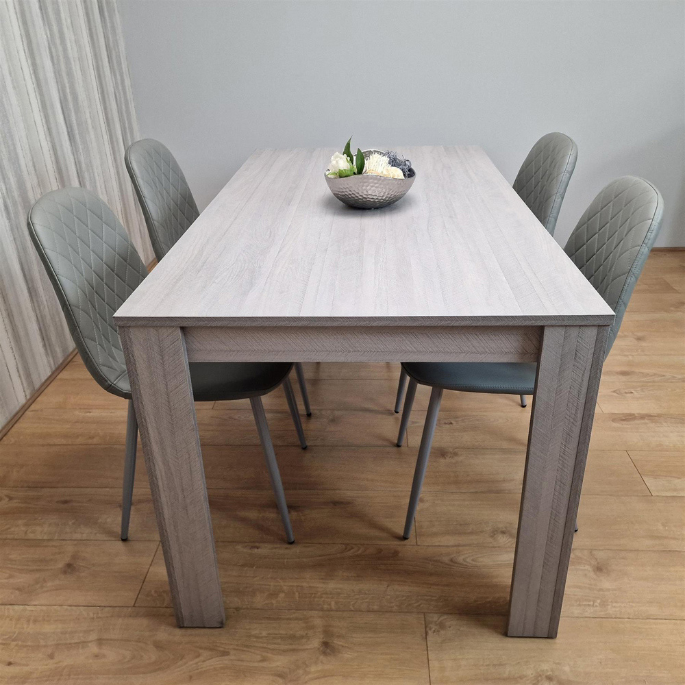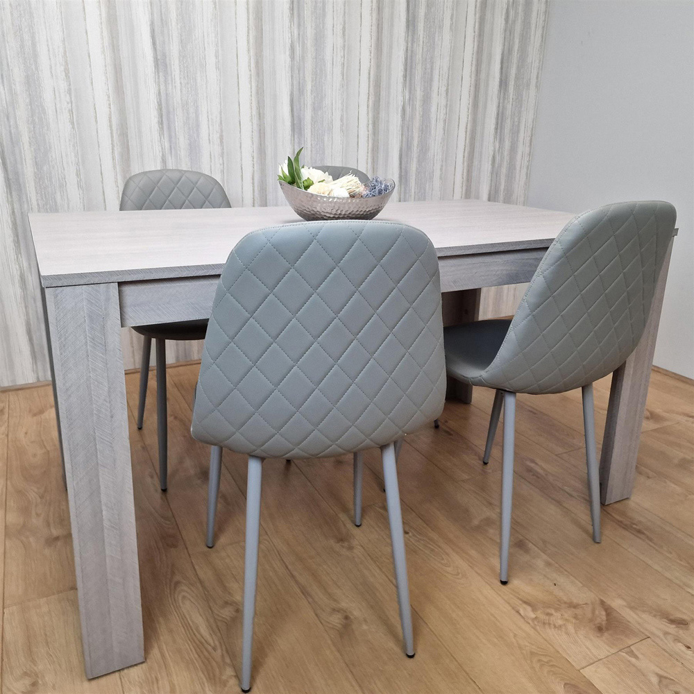 Elevate your dining experience with the Portland 4-seater Dining Set. Featuring a light grey wooden dining table and four matching grey chairs, this set brings a touch of refined style to any room. The chairs boast a distinctive diamond-stitched pattern on both the front and back, adding a luxurious feel to your dining experience. The table is constructed from high-quality MDF with a melamine laminated finish, ensuring a robust and enduring surface. The chairs are made with premium leather and supported by sturdy metal legs for enhanced stability. Easy assembly is guaranteed with the included instructions. Chair dimensions: H85 x W44 x L52cm. Table dimensions: H75 x W77 x L117cm. The seat height of the chairs is 44cm.