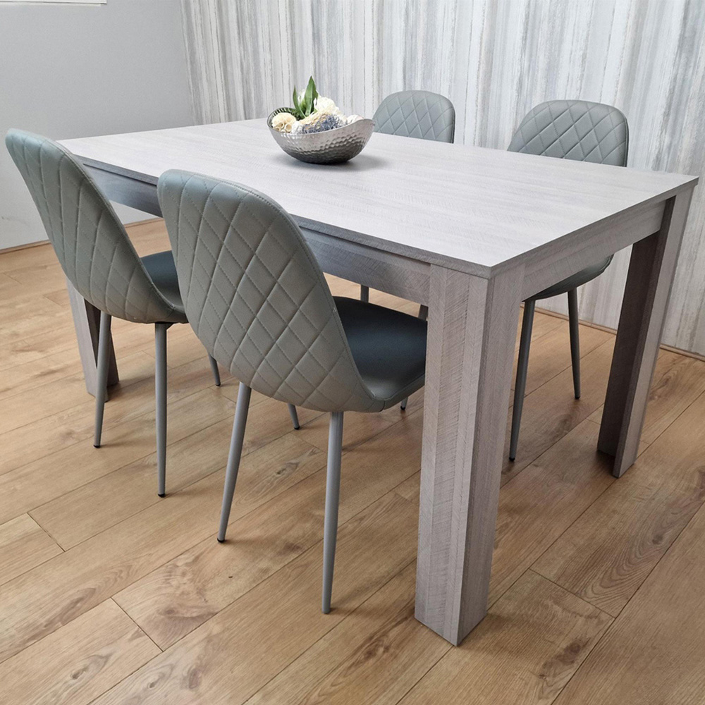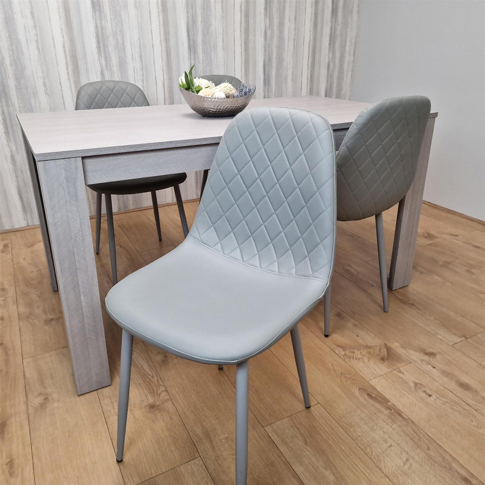 Elevate your dining area with the Portland 4-seater Dining Set. This stunning set features a refined grey wooden dining table accompanied by four matching grey chairs. The chairs are distinguished by their diamond-stitched detailing on both the front and back, bringing a touch of opulence to your dining experience. The table is expertly constructed from high-quality MDF with a melamine laminated finish, ensuring a robust and enduring surface. Premium leather chairs with sturdy metal legs provide exceptional stability. Easy assembly is guaranteed with the included instructions. Chair dimensions: H85 x W44 x L52cm. Table dimensions: H75 x W77 x L117cm. The seat height of the chairs is 44cm.