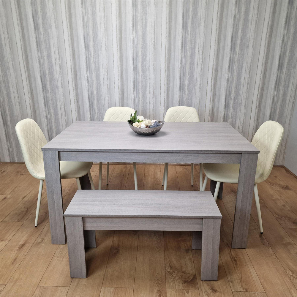 Introduce an element of refined style to your dining area with the Portland Leather and Wood 6 Seater Dining Set. This eye-catching set includes a light grey wooden table, four complementary chairs, and a bench, creating a cohesive and inviting space. The chairs are upholstered in a cream-coloured leather, complete with a sophisticated diamond-stitched pattern on the front and back, exuding elegance. The dining table is constructed from high-quality MDF with a melamine laminated finish, ensuring a robust and enduring surface. The dining chairs feature premium leather and are supported by sturdy metal legs, guaranteeing both comfort and long-lasting durability. The bench, crafted from high-quality MDF, measures L90 x W30 x H45 cm. Simple self-assembly is required, with clear instructions included. The chair dimensions are H85 x L52 x W44 cm, the table dimensions are H75 x L140 x W80 cm, and the seat height of the chairs is 44 cm.