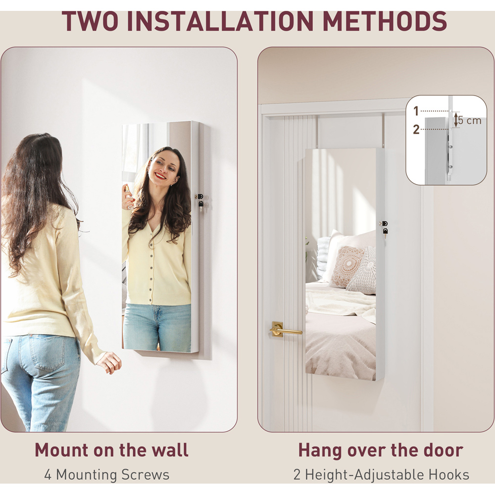 Keep all your jewellery, make-up and perfume together with this Portland Door and Wall Mounted Jewellery Cabinet with pink lining. It comes with 80 earring slots, 90 stud holes, 24 necklace hooks, 78 ring slots, three bracelet rods, lipstick and make-up toolboxes, storage bags, shelves and drawers. All is secured and protected with the lockable magnetic door. Complete with a front full-body mirror to see yourself fully before leaving the house. The inner also features LED lights, making it easy to see inside at any time of the day. Note: Requires 6 x AA batteries, not include2d.