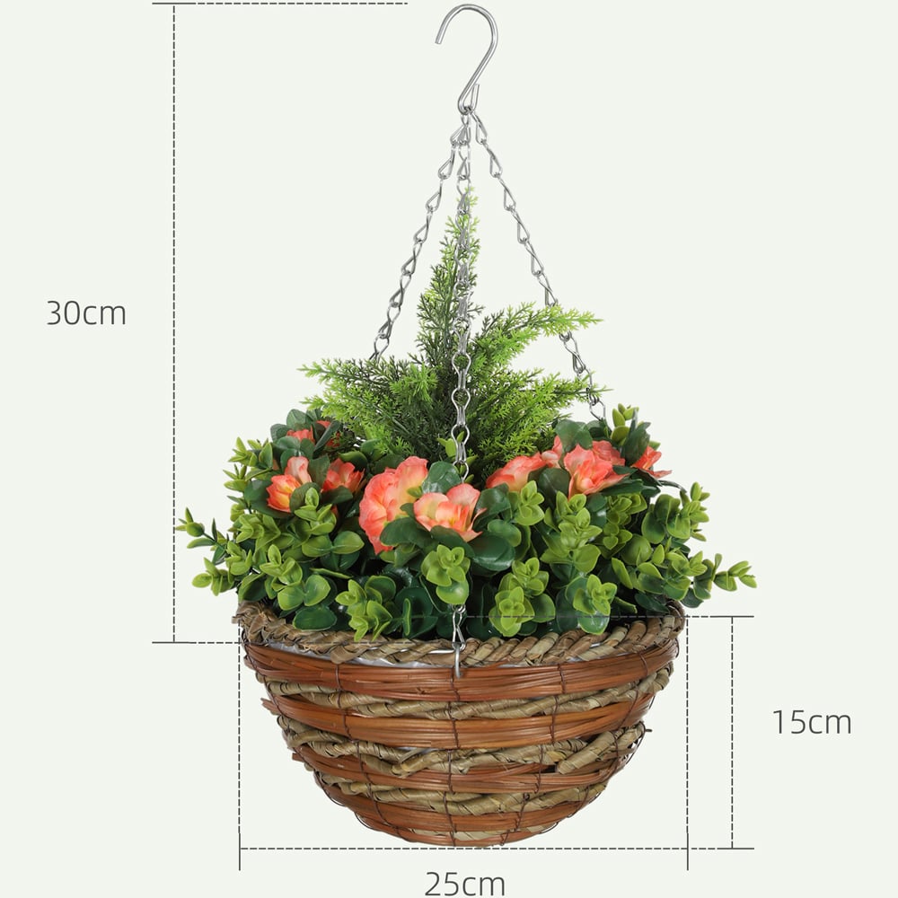 Add a burst of colour to any space with the Portland Set of 2 Orange Lisianthus Artificial Faux Flower in Wicker Hanging Basket. These faux plants are a fuss-free way to refresh your decor, whether indoors or outdoors. Each pot features 18 faux lisianthus flowers and 72 leaves, crafted from plastic for a realistic look and feel. The included wicker pots are pre-filled with cement soil for stability, and the metal chains and hooks make them easy to hang. With their vibrant colours and natural textures, these hanging plants offer year-round beauty, with no watering or maintenance needed.