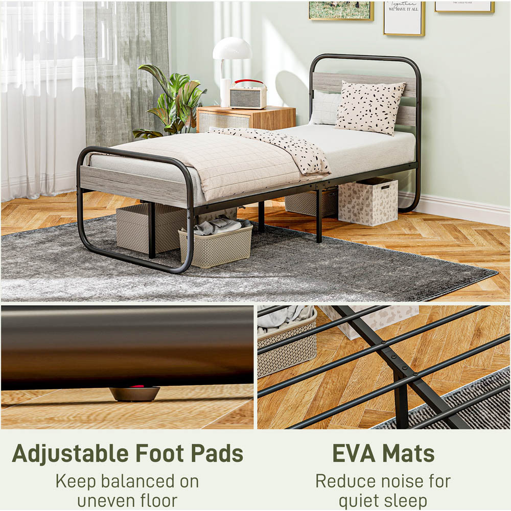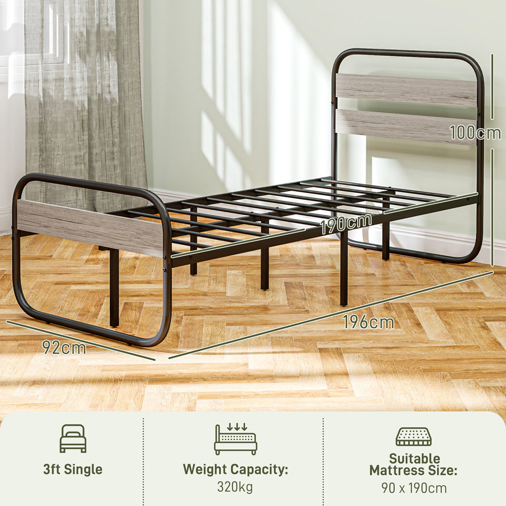 Make it minimal during sleep with this Portland Single Metal Storage Bed Frame. The dark black frame with a wood-effect headboard and footboard lends a cool industrial look. The 31.5 cm bottom space is made for keeping boxes and spare items out of sight. Made from steel, this is a strong and supportive bed frame - complete with adjustable feet.