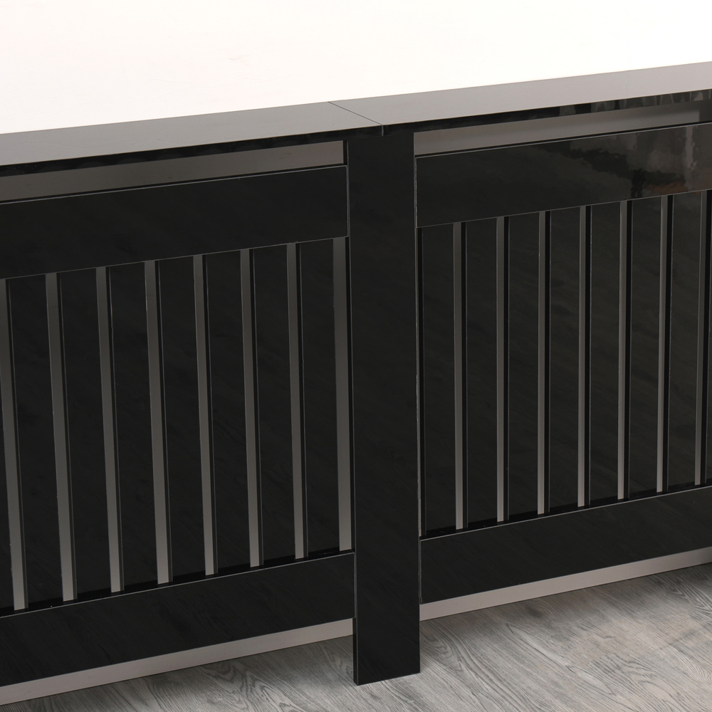 This stylish high-gloss black radiator cover adds a touch of modern sophistication to any room. More than just a cover, its top surface provides a perfect display area for photos, plants, or other decorative items, showcasing your personal style. Designed for stability with a wall-hanging device, it also features a practical skirting board cut-out for easy installation over most standard boards. Crafted from chipboard with a durable high-gloss UV finish, it's easily cleaned with a damp cloth. External dimensions are W172 x D19 x H85cm, while the internal dimensions measure W166.5 x D16.5 x H82cm. Please ensure you measure your radiator carefully and select the cover based on the internal size. This item is flat-packed for self-assembly, with clear instructions provided for a straightforward process.