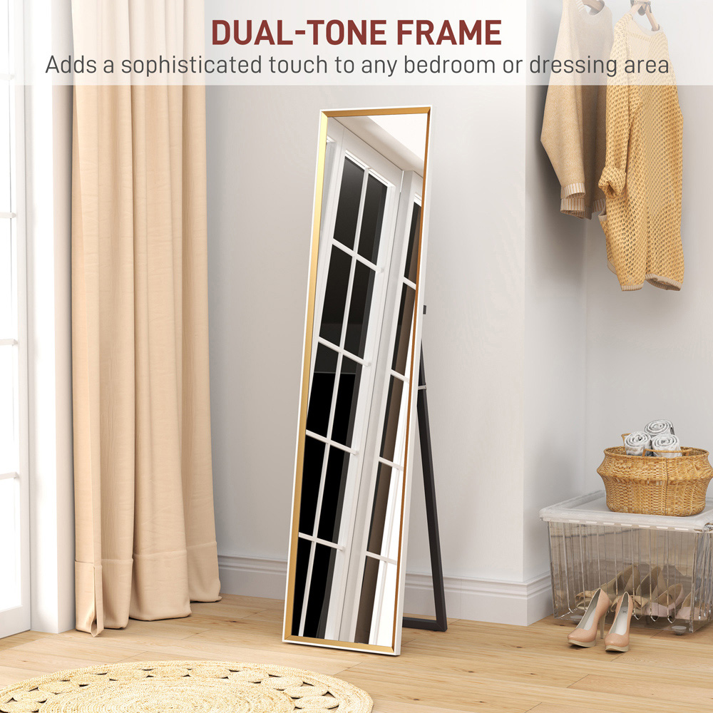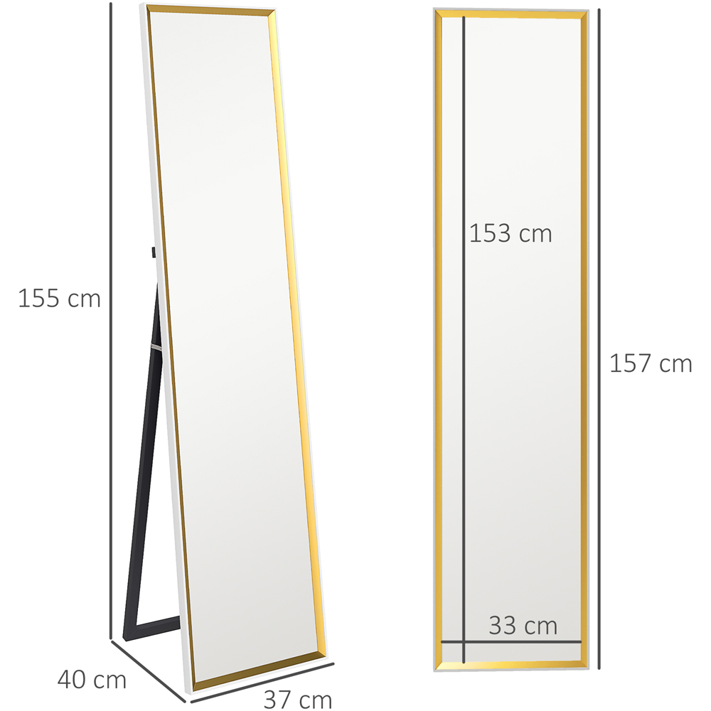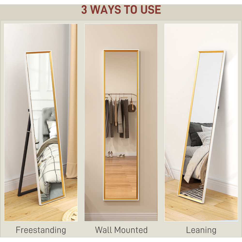 Everyday elegance, with a home essential - this Portland White Full Length Standing or Wall Mounted Mirror. Measuring 157 x 37cm, the HD mirror with shatter-proof film offers a complete head-to-toe view - be confident in your outfit before leaving the house. It can be used as a standing mirror with the leg, as a leaning mirror against a wall, or mounted onto a wall - adaptable to your changing needs. With the white and gold-tone frame, this is a beautiful addition to your space, however, you decide to fix it.