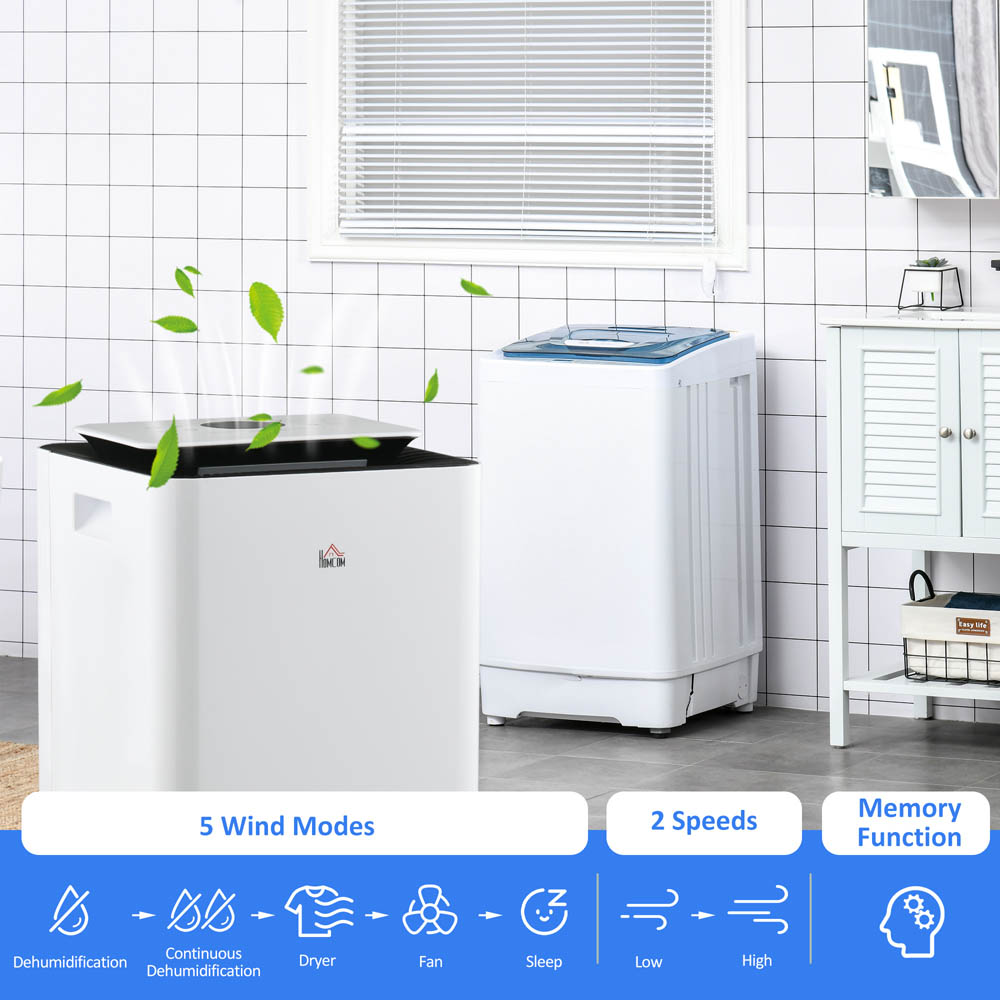 Keep your home's air fresh and dry with this portable dehumidifier and air purifier. Protect walls, furniture, and appliances from the damage caused by excess moisture. Choose from two speeds and four modes for customized operation, easily monitored on the LED screen which displays humidity levels and selected settings. Safety features include a light warning, tank cut-off, and a child lock for added peace of mind. A 6.5L tank is provided for convenient operation, while connecting a hose enables continuous use with up to 16 litres of moisture removal capacity.