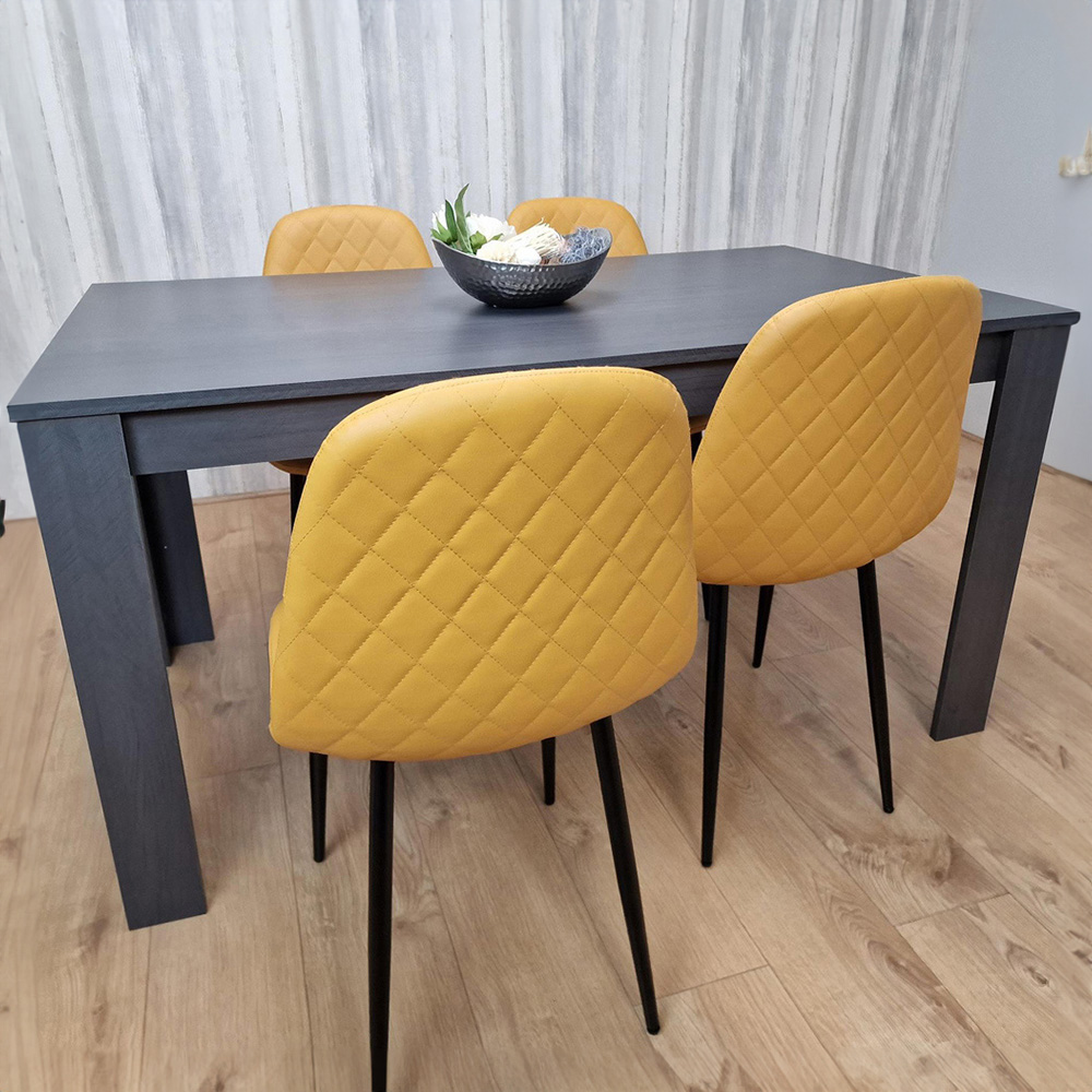 Elevate your dining experience with the Portland 4 Seater Dining Set, a striking blend of style and practicality. The dark grey wooden dining table, crafted from durable MDF with a melamine laminated finish, provides a sophisticated centrepiece for any dining room. Complementing the table are four mustard-coloured chairs, upholstered in premium leather and supported by sturdy metal legs. Easy to assemble with clear instructions provided, this set includes a table and four chairs, with the table measuring H75 x L140 x W80 cm and the chairs measuring H85 x L52 x W44 cm, with a seat height of 44 cm.