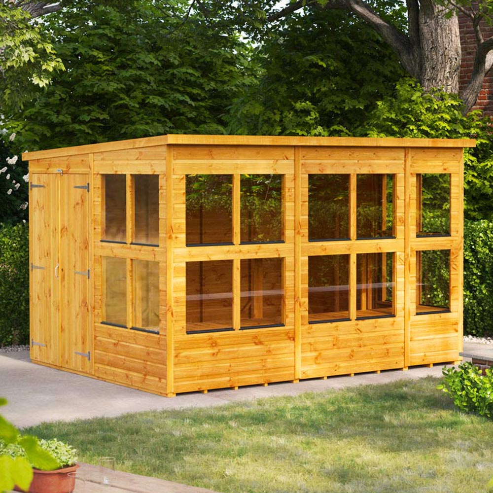 This robust 10 x 8ft Pent Double Door Potting Shed is a premium garden storage solution, built from high-grade timber for lasting durability. The dip-treatment process, incorporating a waxe additive, protects the wood for a full year without needing retreatment, each component is fully submerged to ensure complete coverage. You can easily customise your shed',s layout during assembly by positioning the double doors and windows on any side. Convenient two-tiered stageing units are included, providing ample shelving space within the shed',s frame, perfect for tools and plants.