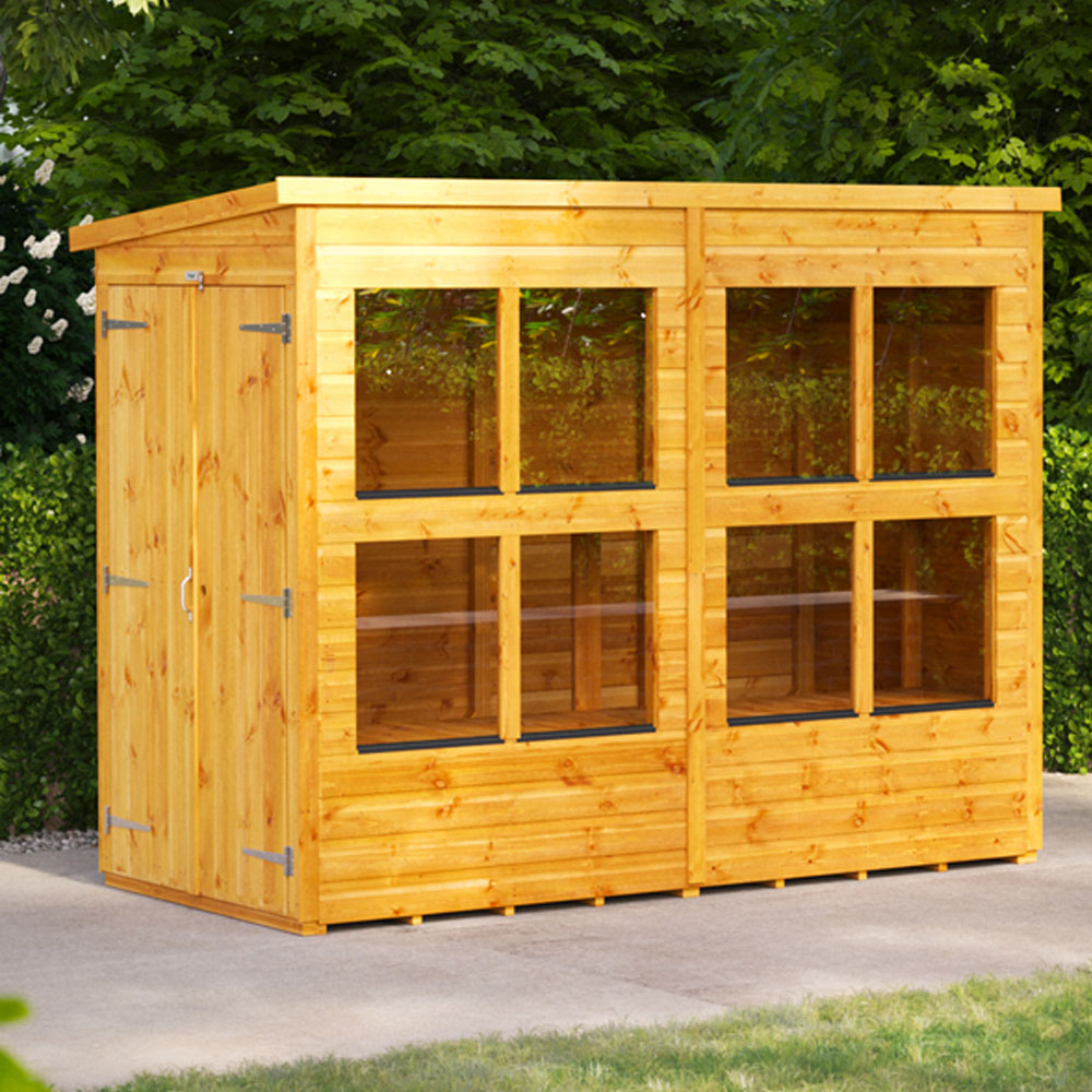 Enjoy the ultimate in garden storage with the Power 8 x 4ft Pent Double Door Potting Shed. This premium shed boasts high-grade timber, expertly dip-treated with a special waxe-additive wood preserver for a full year of protection against the elements before needing another treatment. The dip treatment ensures every component is thoroughly coated. You',re in control of the assembly, with the freedom to position the door and windows on any side to suit your garden perfectly. Plus, two-tiered stageing units are included, offering convenient shelving for your tools and plants.