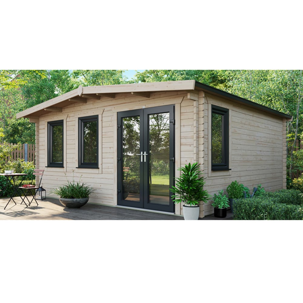 Enhance your garden with the Power Sheds 16 x 16ft Right Door Chalet Log Cabin, a practical and stylish building. Constructed with robust 44mm thick, high-grade timber walls, this cabin offers exceptional durability and strength. The anthracite grey uPVC double doors and 'Tilt and Turn' opening windows not only provide a contemporary look but also ensure excellent security and insulation.