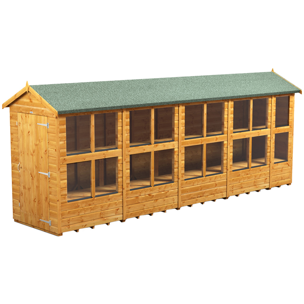 Enjoy the flexibility of the Power 18 x 4ft Apex Potting Shed',s easy self-assembly. Place the door and windows on any side during construction. Built with premium-grade timber, each shed is dip-treated with a special waxe-additive wood preservative, eliminating the need for re-treatment for a whole year. Every component is fully coated during this thorough process. Two-tiered stageing units are also included, perfectly fitting the shed',s frame and offering ample storage for your tools and plants.