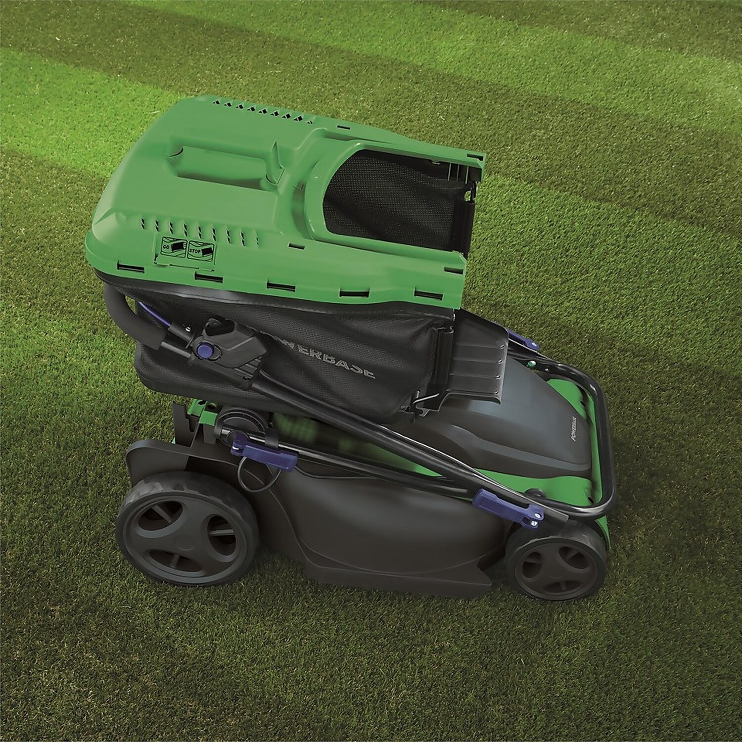 Achieve a beautifully manicured lawn with this Electric Lawn Mower, designed for a professional finish. A standout feature is the rear roller, which leaves your lawn with a stylish striped effect while also helping to prevent scalping. The cutting height is easily adjustable with a single lever—no tools required—ranging from 70mm (ideal for the first cut of the year) down to 20mm in 10mm increments, offering a total of 6 cutting heights to suit your desired finish. This mower comes with a mulching plug that allows the finely cut grass to be returned to your lawn, adding nutrients for healthier growth. It also eliminates the need to stop and empty the grass bag when mowing large areas. If you prefer to collect the clippings, simply remove the mulching plug and use the collection bag as usual. Mulching is especially useful for the first few cuts of the season. All Powerbase electric rotary lawnmowers feature patented Turbo Drive and Air-Lift technologies. Turbo Drive ensures consistent torque for an even cut, even through thicker patches of grass, while Air-Lift, inspired by wind tunnel testing and using a winged carbon steel blade, helps direct the clippings to the back of the collection bag for maximum grass collection. The mower also includes a patented Ready-bag, which attaches easily right out of the box. When not in use, the bag collapses flat for convenient storage.