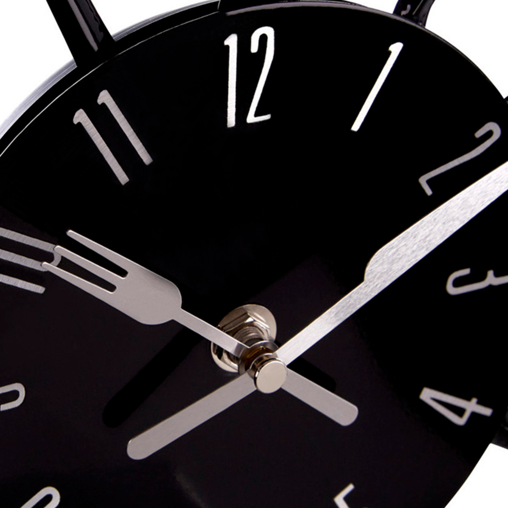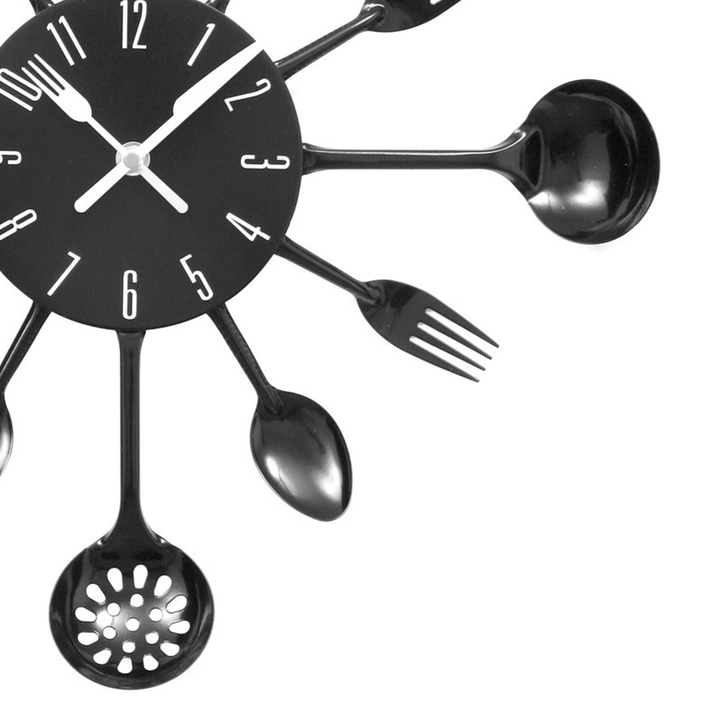 A stylish kitchen wall clock, the Premier Housewares Black Cutlery Metal Wall Clock (43cm) makes a fun and functional statement. Its round face creatively uses kitchen utensils or cutlery pieces as numerals, while distinctive knife and fork hands add a playful touch. The durable metal construction boasts a sleek black finish offset by metallic silver accents.