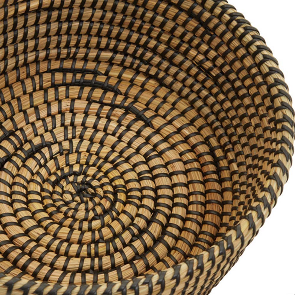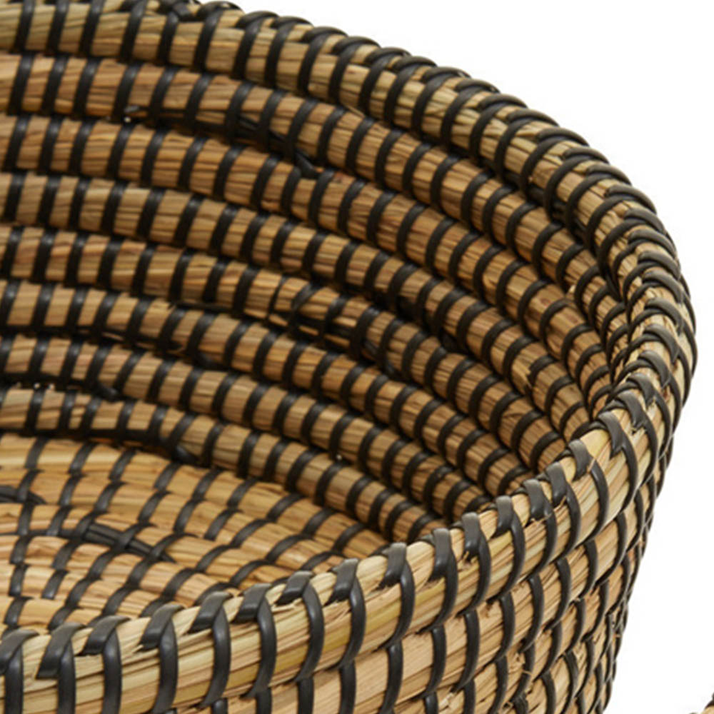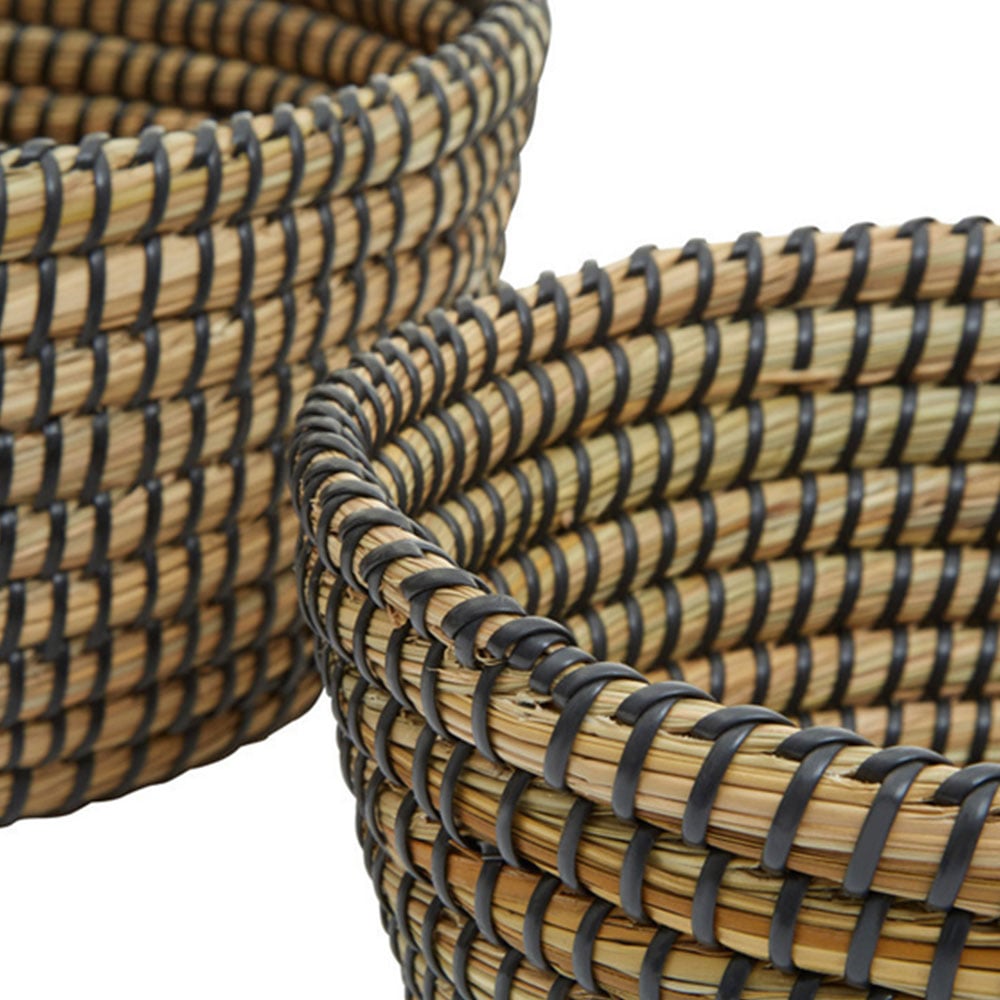 This set of three oval straw baskets offers ample storage and adds warmth and sophistication to your home. Crafted from natural straw, each basket features a charming rounded design with twisted seagrass detail in a black finish accenting the tubular sides. Perfect for any room, these baskets are a beautiful and practical storage solution.