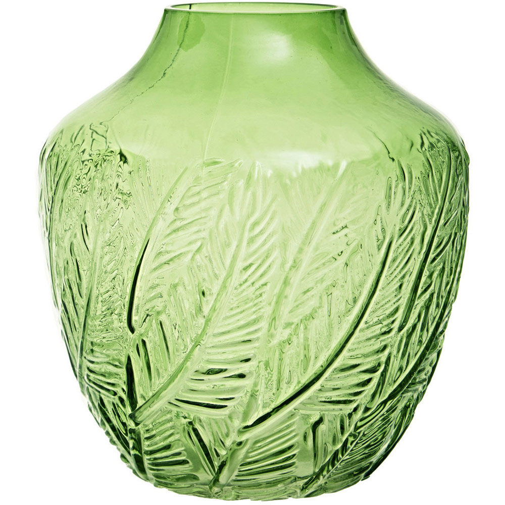 Bring natural beauty indoors with the Corie Small Botanical Green Vase. Its translucent green glass body features an intricate botanical print, adding a touch of magic to any space. The round shape, complemented by a narrowed opening, is ideal for displaying floral arrangements or simply standing alone as a decorative accent. The textured glass adds a pleasing tactile element to its already captivating design. This small vase masterfully combines botanical charm and artistic craftsmanship, a robust and beautiful addition to your home.