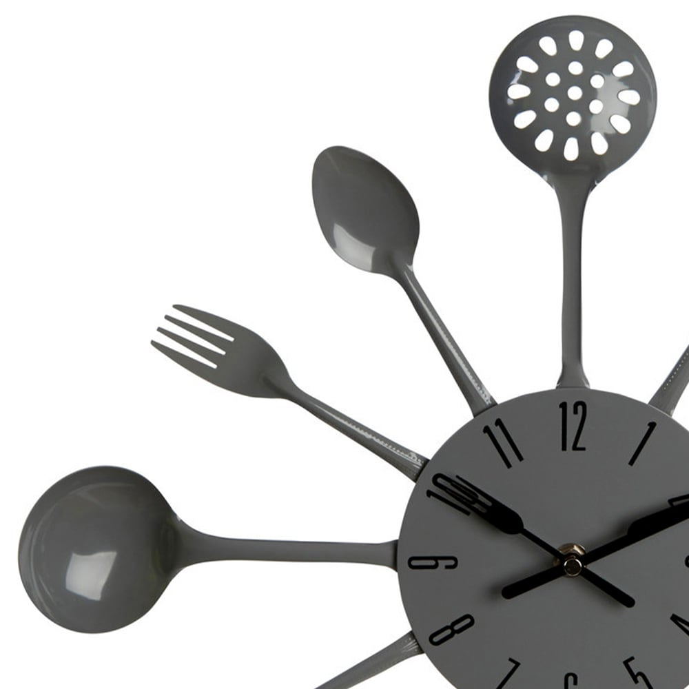 A stylish grey wall clock, perfect for adding a touch of culinary charm to your kitchen. Crafted from durable metal with a sophisticated grey finish, this 33cm timepiece features a unique design showcasing spoons, ladles, and strainers on the clock face. The playful fork and knife hands complete the whimsical aesthetic. A timeless design that effortlessly blends practicality with fun.