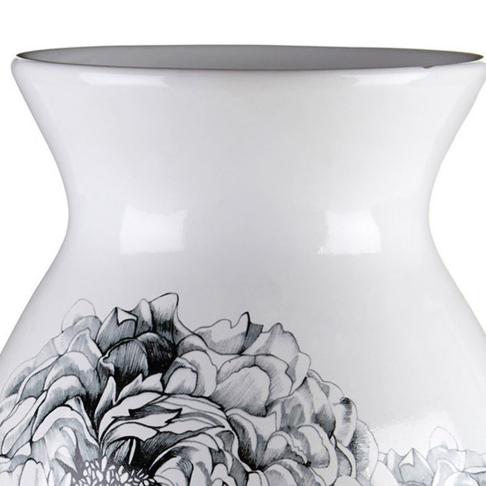This medium-sized ceramic vase, crafted from pure dolomite, is a beautiful addition to any home. Its delicate shape and smooth surface belie a surprising strength and durability. The crisp white finish beautifully highlights the etched floral detail on its front. The subtly pinched neck flares outwards, providing ideal support for a flower arrangement, whether fresh or artificial. Its classic white and black tones effortlessly complement monochrome furnishings.