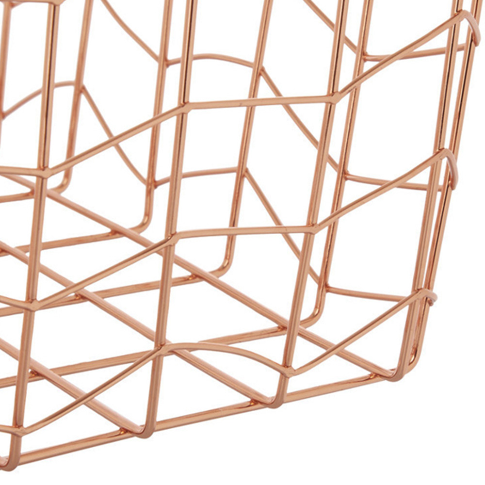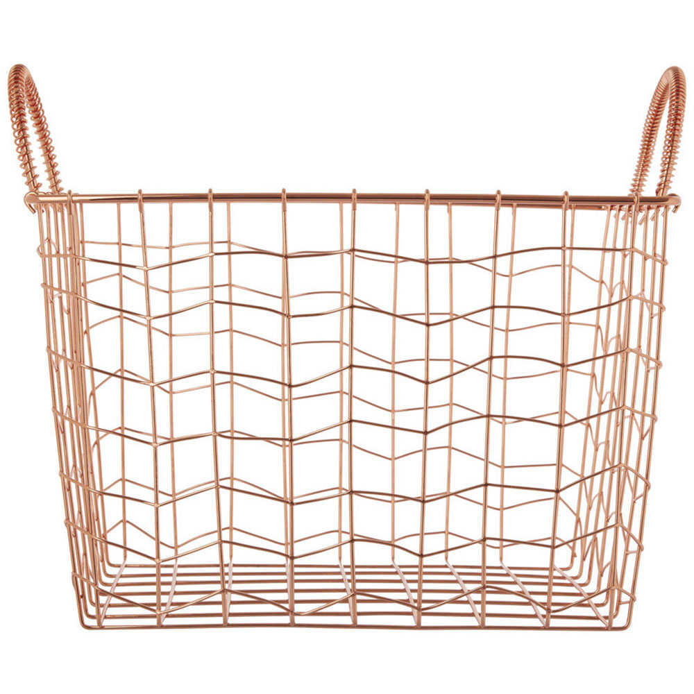 This rectangular wire basket from Premier Housewares adds stylish storage to any home. Its wavy grid pattern, created by intersecting iron wires, offers a sleek and unique look. Convenient round handles are integrated on both sides of the tapered basket. The luxe metallic finish provides ample storage while adding a touch of elegance.