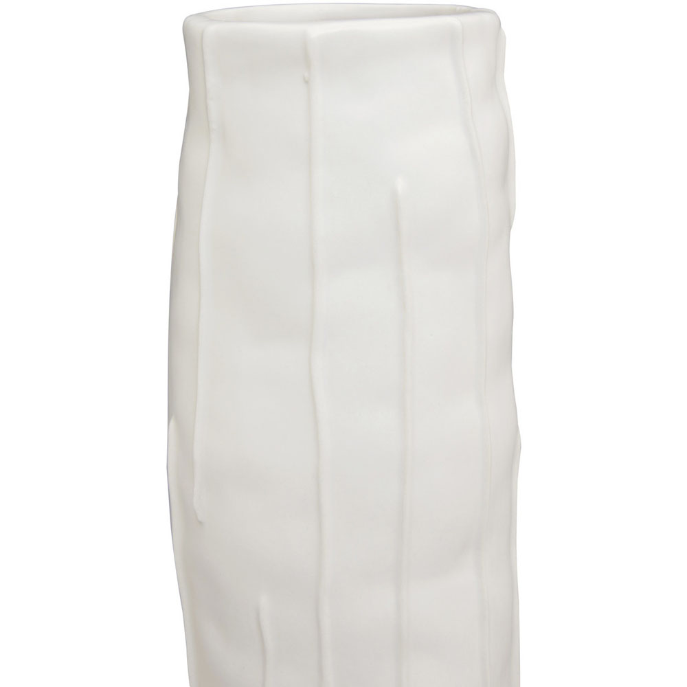 The Fara Large Vase, a Premier Housewares design, boasts a cylindrical silhouette with an uneven, textured body and vertical lines. Its white finish and ceramic construction evoke the look of ancient ceramic, lending a unique coastal style to any interior.