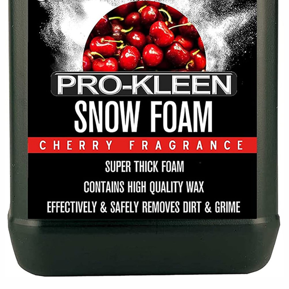Unleash the power of Pro-Kleen Cherry Snow Foam for a deep clean that leaves your car gleaming. This pH-neutral, non-caustic formula lifts away stubborn dirt and grime by getting underneath the dirt particles and lifting them away from the car's surface, so that when you rinse the snow foam away, the dirt and grime rinse away too! Leaving behind a sparkling finish thanks to its wax-infused formula. Compatible with all snow foam lances and pressure washers, simply mix with water, load into your lance, and spray for effortless cleaning. Suitable for all vehicles. Experience the satisfaction of a truly pristine car.