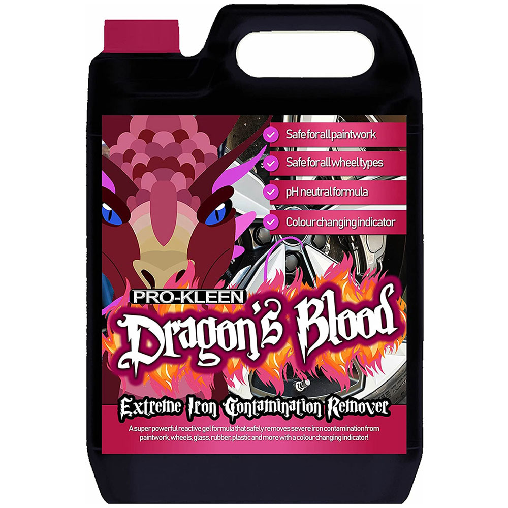 Banish iron contamination with Pro-Kleen Dragon',s Blood Fallout Remover. This highly concentrated formula is tough on iron deposits yet gentle enough for all exterior car surfaces: paintwork, wheels, glass, plastic, rubber – you name it. Specifically designed for wheel cleaning, its powerful action tackles iron contamination anywhere it appears on your vehicle',s exterior. Simply spray onto the affected area, leave for 5-10 minutes to watch the magic purple transformation unfold, agitate if needed, and then rinse with warm water. Available in a convenient 5L pack.