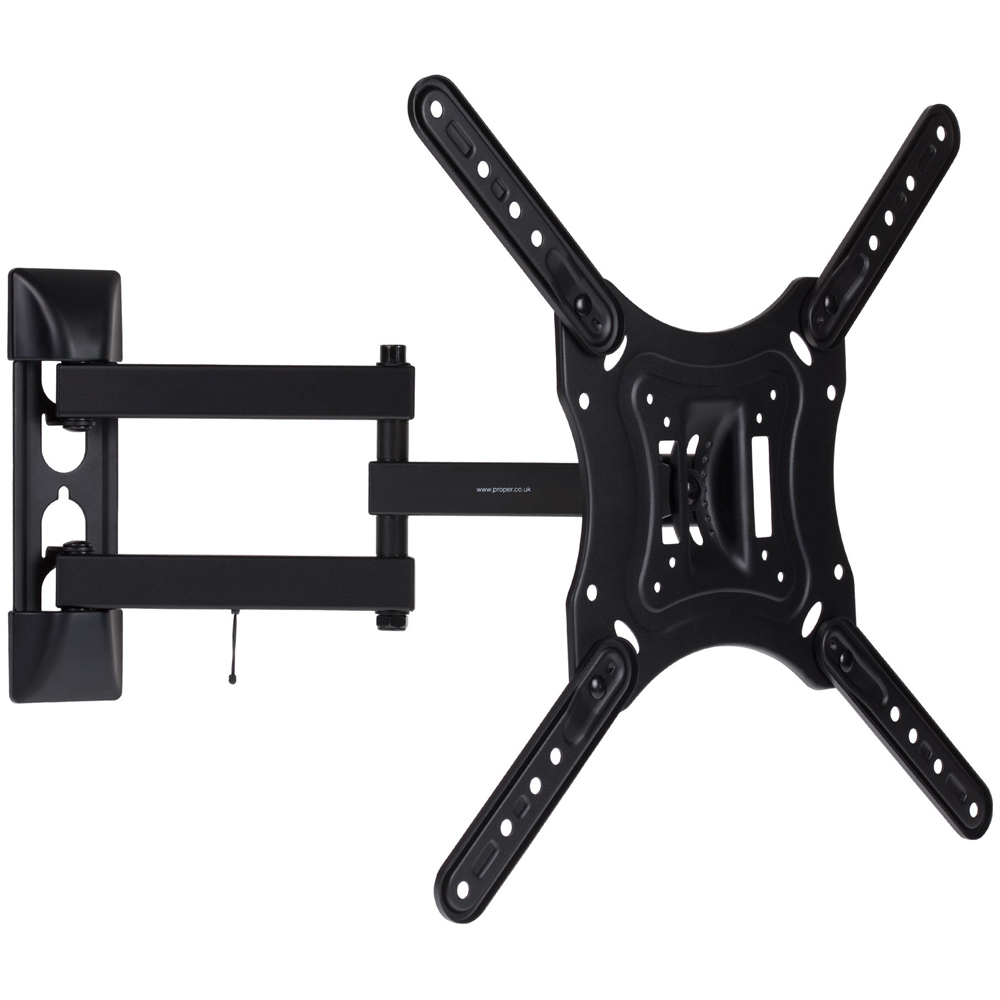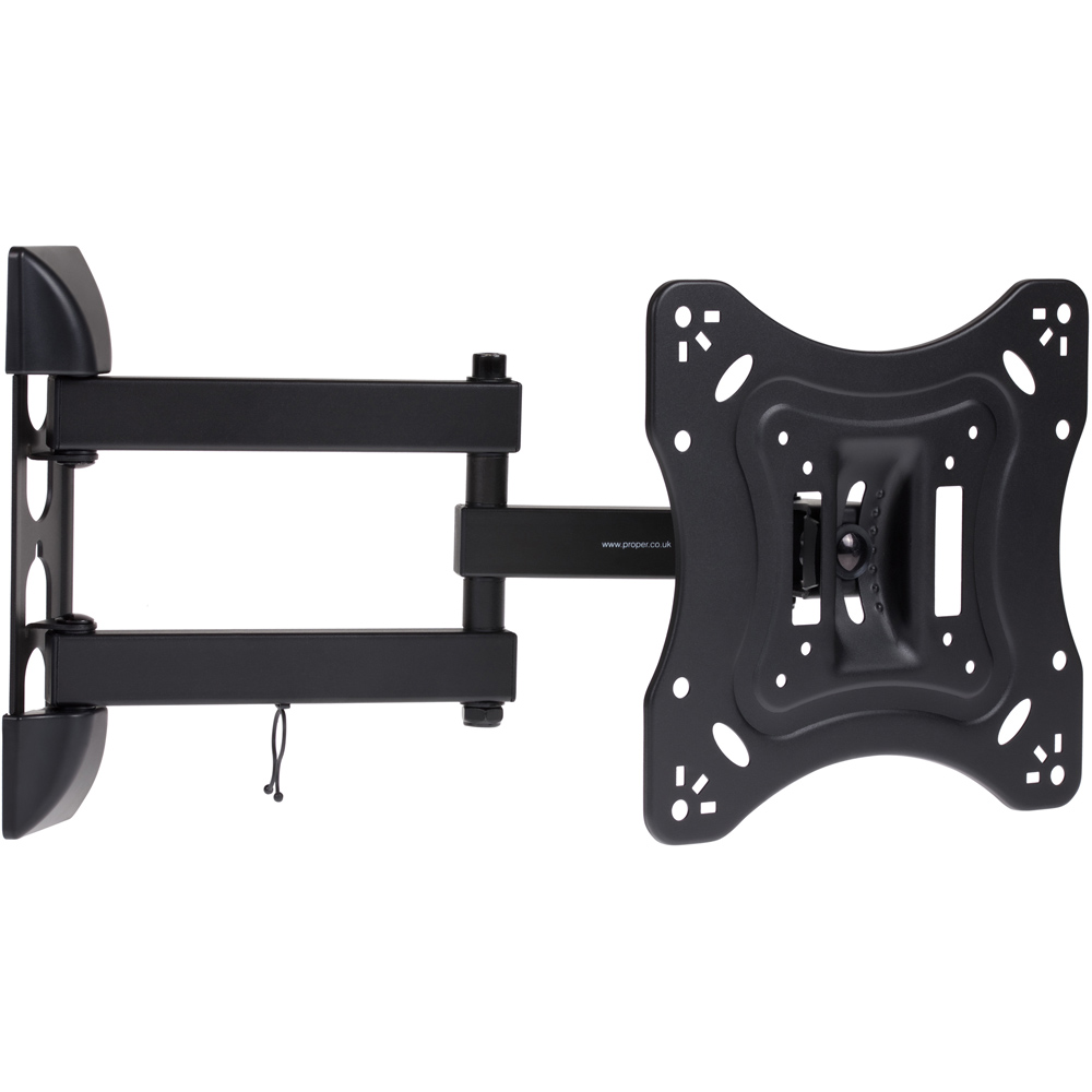 Effortlessly position your television with the Heavy Duty Swing Arm TV Wall Bracket. This robust mount, crafted from high-grade aluminium, boasts a 45-degree swivel (left and right) and a 20-degree tilt (up and down), ensuring the perfect viewing angle. Supporting TVs up to 30kg, it's a versatile solution for various spaces, from living rooms to smaller areas like kitchens and bedrooms. Suitable for a wide range of screen sizes (23, 24, 28, 32, 37, 40, 42, 43, 46, and 55 inches) and VESA patterns (75 x 75, 100 x 100, 200 x 100, 200 x 200, 400 x 200, 300 x 300, and 400 x 400), this bracket includes all necessary mounting hardware and cable clips for a quick and easy installation. The bracket is black in colour.