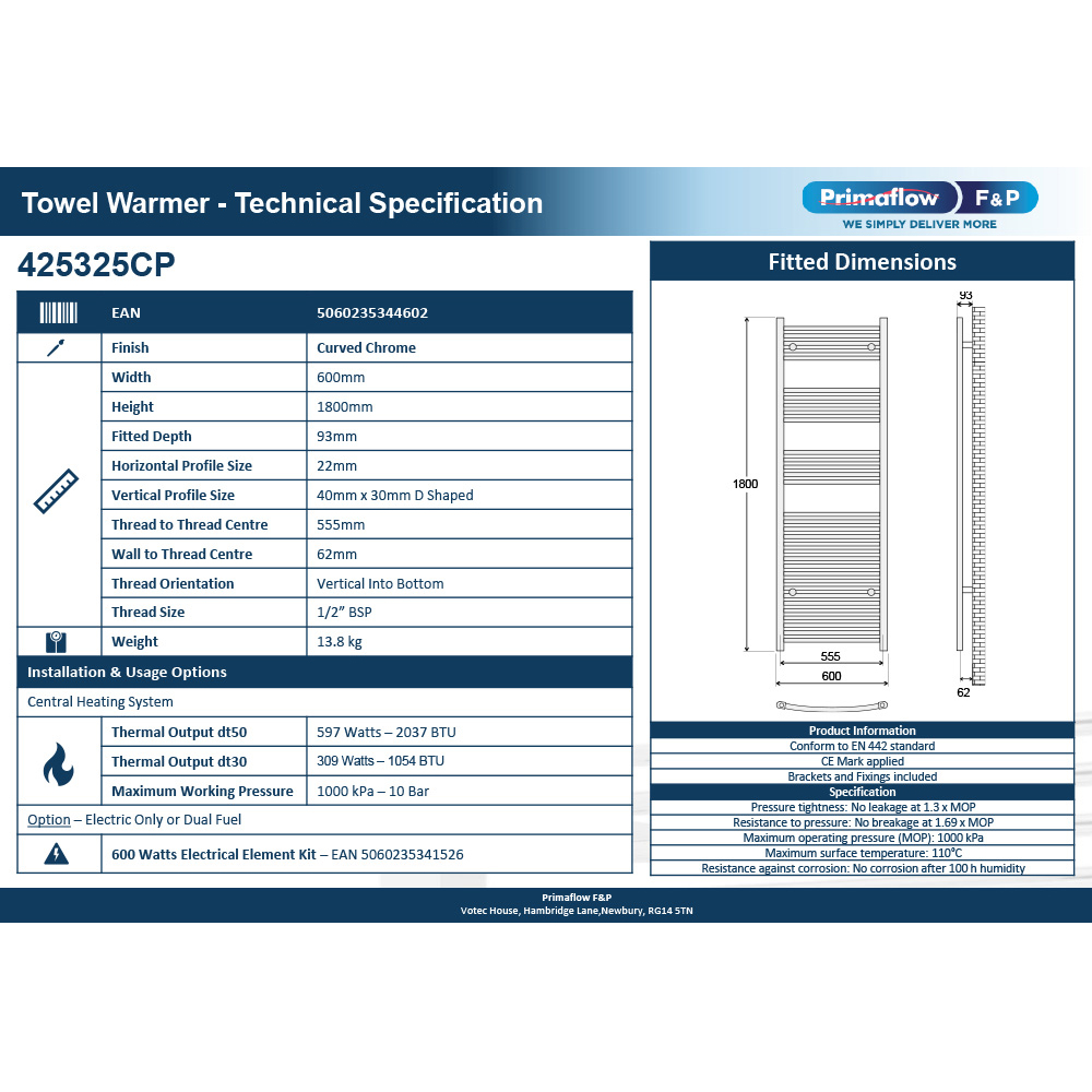 Prorad 2 Curved Chrome Towel Rail 600 x 1800mm