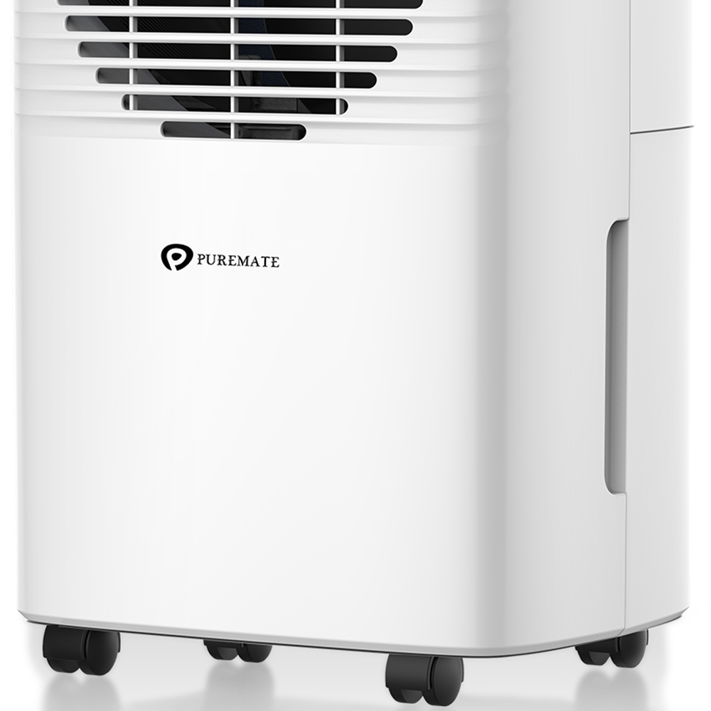 Enjoy a healthier home with the PureMate White Dehumidifier. This portable unit effortlessly removes up to 10 litres of moisture daily, significantly reducing humidity and the growth of allergens. Its compact design and durable caster wheels ensure easy mobility between rooms. Precise humidity control is achieved via intuitive touch controls and an LCD display, complemented by a 24-hour timer, two fan speeds, and a removable 2L water tank for added convenience. Note that moisture removal capacity depends on room size, temperature, and humidity levels.