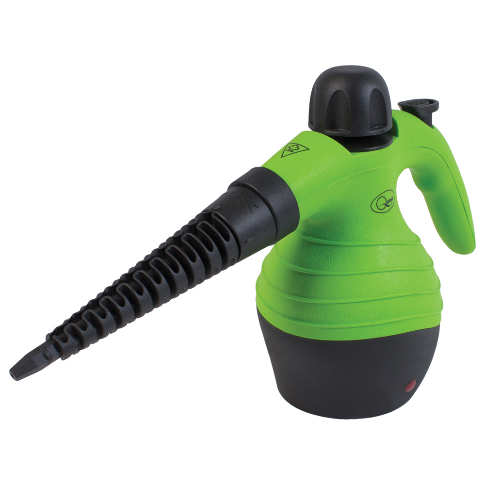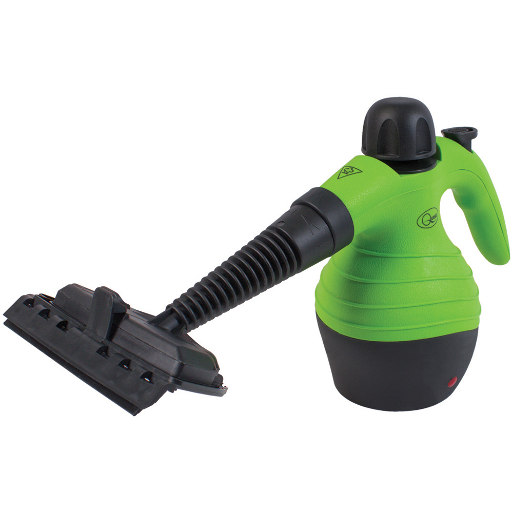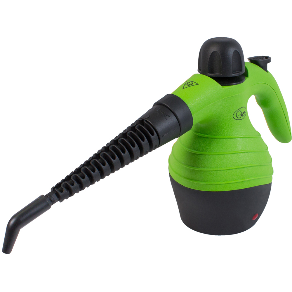 Effortlessly clean your entire home with the Quest Green Handheld Steam Cleaner. Its 350ml water capacity tackles kitchen appliances, clothes, upholstery, cars, bathrooms—any surface needing a deep clean. Powerful 1000W steam cuts through grease and baked-on food, leaving cookers and ovens sparkling. Nine versatile accessories—long spray nozzle, round brush nozzle, bent spray nozzle, garment steamer, window squeegee, flexible extension, funnel, measuring cup, and towel sleeve—adapt to any cleaning task. Enjoy a chemical-free clean, safe for your family and appliances. The steam safety valve and three-bar high-pressure steam ensure optimal cleaning. Compact at 25 x 14 x 23cm.