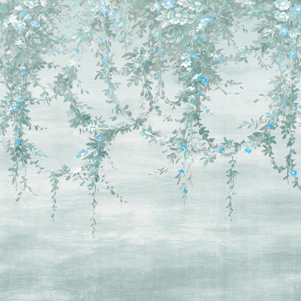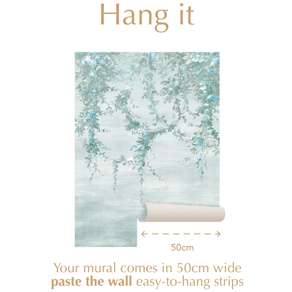 Evoking the dreamy beauty of a classic English garden, the Hanging Garden Mural will transform any room with its enchanting charm. Trailing garlands of fern green leaves cascade alongside delicate teal and bright blue blooms, set against a muted grey, duck egg watercolour-effect backdrop reminiscent of timeworn stone in historic country manor gardens. The mural's hand-painted aesthetic delivers a visually captivating design, bringing an authentic and whimsical touch to your home.