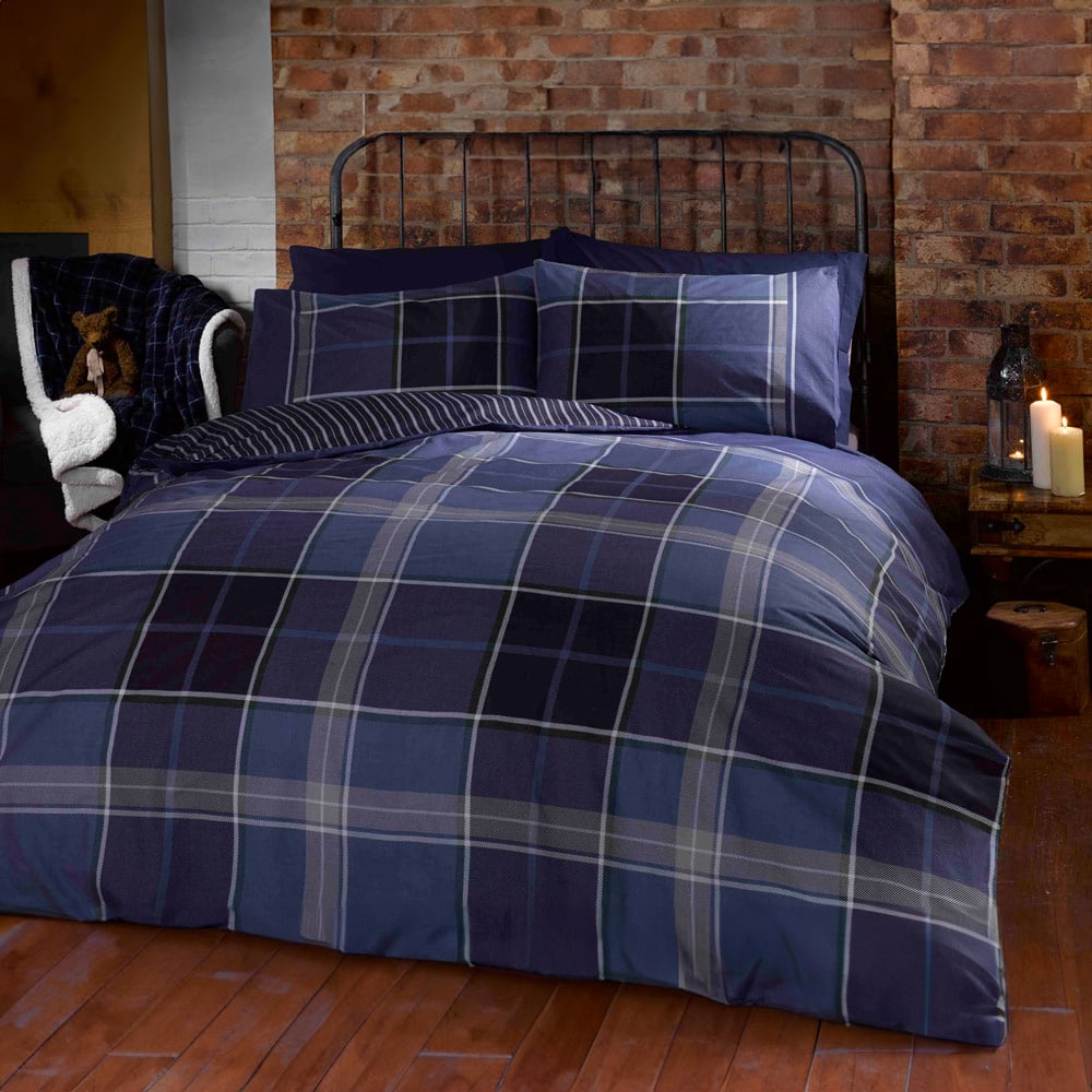 Transform your bedroom with the comforting Rapport Home Argyle Duvet Set. This double-size set includes a duvet cover (200 x 200cm) and two matching pillowcases (50 x 75cm), each showcasing a charming checked pattern in blue and a contrasting cuff detail. The fully reversible striped design offers versatile styling options. Convenient popper fastenings complete this stylish and cosy bedding ensemble.