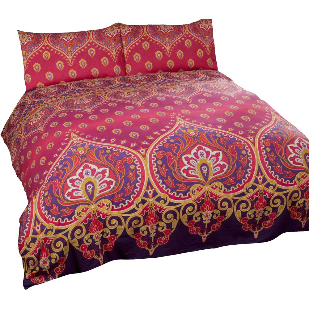 Bring a touch of Indian artistry to your bedroom with the Asha duvet set. This king-size set, featuring a vibrant ruby-coloured, intricately patterned duvet cover and two matching pillowcases, is a stunning addition to any space. The easy-care design requires little to no ironing, while the popper closing mechanism ensures a snug and stylish fit. Dimensions: duvet cover 230 x 220cm, pillowcases 50 x 75cm.