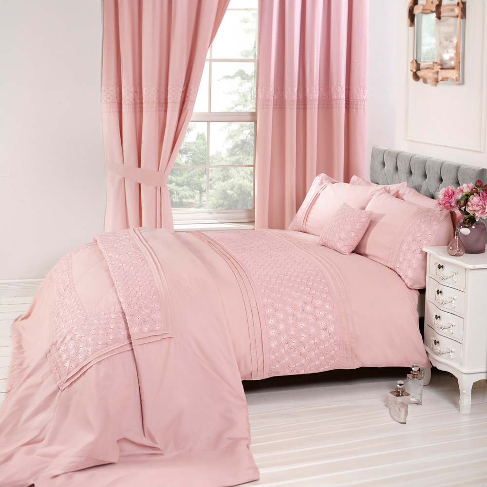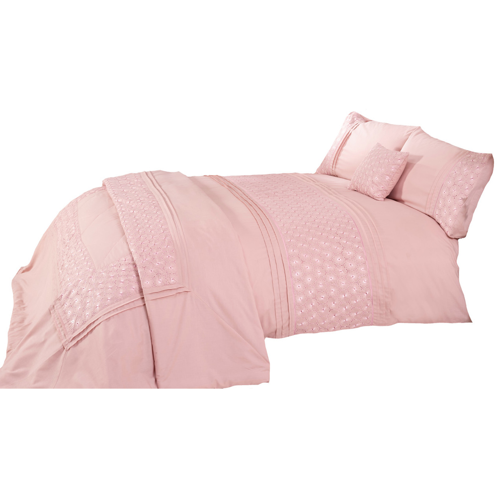 Indulge in the exquisite comfort and elegance of the Everdean Double Pink Duvet Set. This beautifully crafted set features a timeless design with delicately embroidered circles and pintuck edging, creating a fresh and sophisticated look for your bedroom. The duvet cover secures with a convenient button closure, and the set includes one duvet cover (200 x 200cm) and two matching pillowcases (50 x 75cm). Experience the luxurious feel of finely embellished linen.