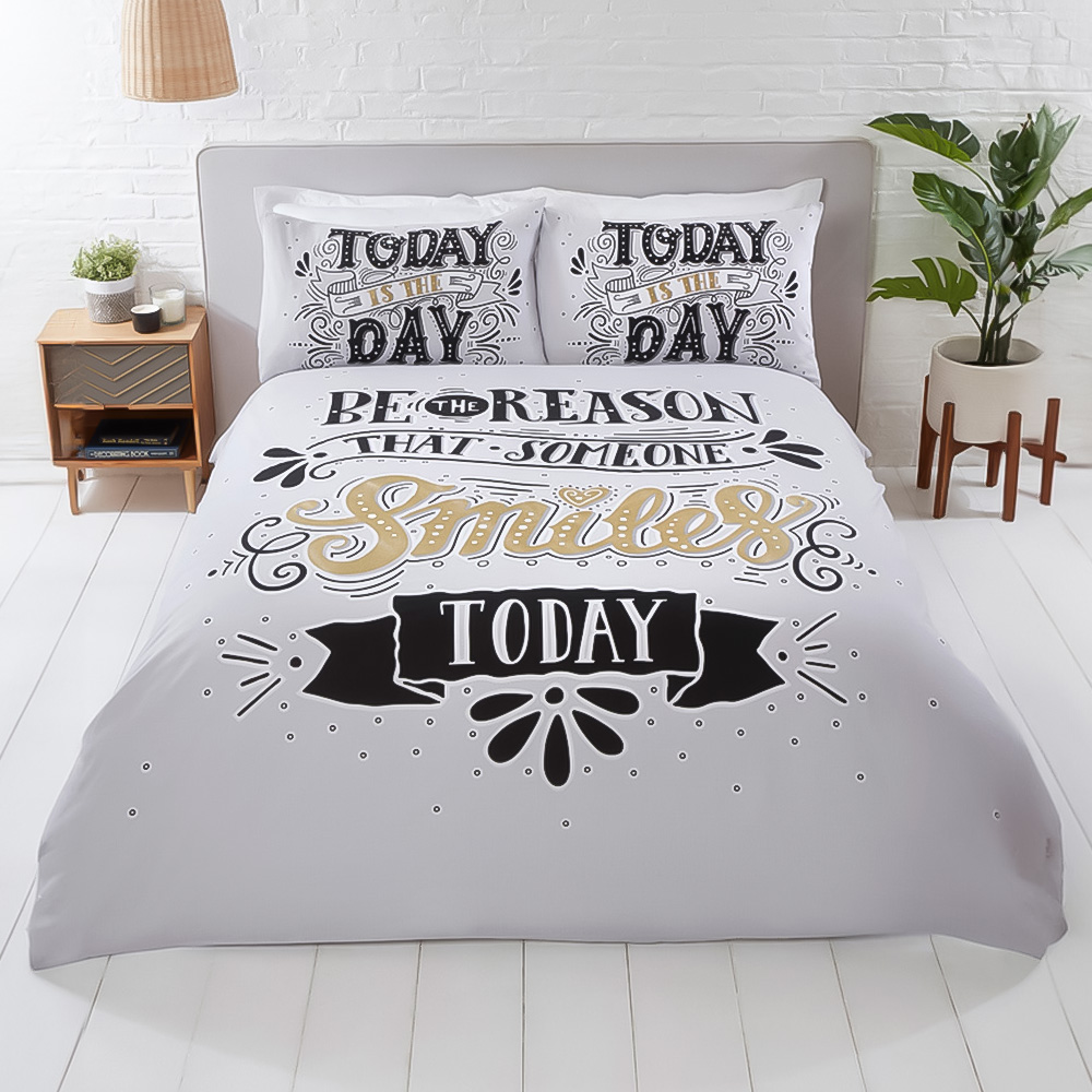 Add a touch of charm to your bedroom with the Rapport Home Multicolour Duvet Set. This king-size set features a delightful design, with "today is the day" printed on the pillowcases and "be the reason that someone smiles today" adorning the duvet cover. Exquisitely printed for a charming addition to any bedroom, the set includes one duvet cover (230 x 220cm) and two matching pillowcases (50 x 75cm.