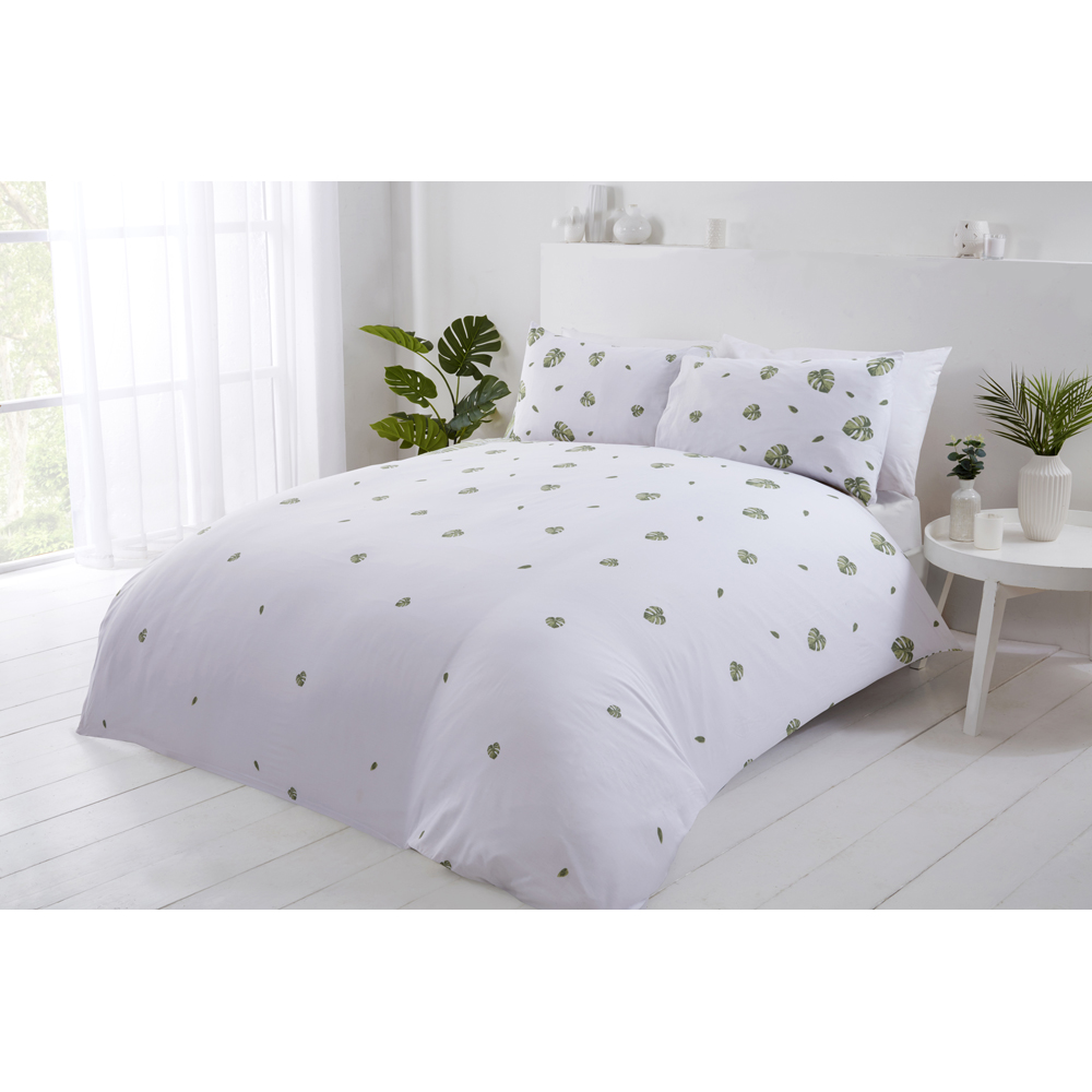 A fresh, clean take on tropical style, this duvet set brings a touch of understated elegance to the bedroom. Bold tropical leaves adorn the front in a vibrant green, complemented by a reverse featuring smaller, scattered leaves. Crafted from sustainably sourced BCI cotton and recycled polyester for easy care, this double duvet set includes a duvet cover (200 x 200cm) and two pillowcases (50 x 75cm). Designed in Britain, it offers a simple yet sophisticated update for your sleeping space.