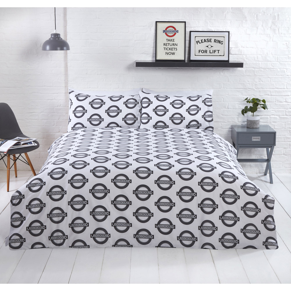 Upgrade your bedroom with the Rapport Home Platform Double Multicolour Reversible Duvet Set. This officially licensed set features a striking vintage photograph of Tottenham Court Road Tube station, guaranteed to make a statement. The coordinating pillowcases, showcasing a matching 'way out' sign print, add to the unique design. For a versatile look, simply reverse the duvet to reveal a stylish classic underground sign print. The set includes one duvet cover (200 x 200cm) and two pillowcases (50 x 75cm.