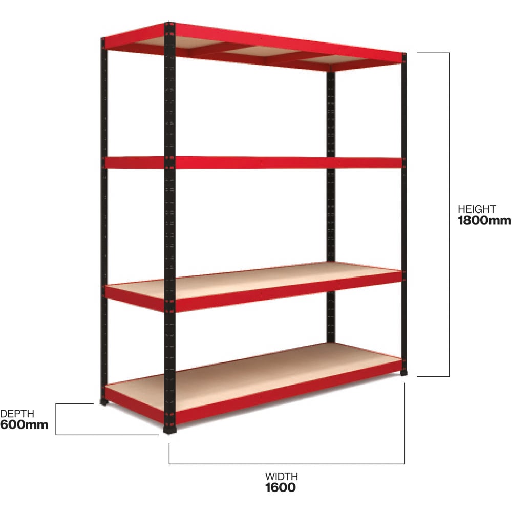 The ultimate storage solution: a robust, freestanding shelving unit perfect for any environment. Its heavy-duty steel frame, finished in a striking red and black powder coat, supports four durable medium-density fibreboard shelves, each capable of holding an impressive 500kg. Effortless boltless assembly means you',ll have ample storage space in minutes. Ideal for garages, workshops, sheds, utility rooms, offices, or even your home. Remember, images are for illustration only – please verify dimensions before purchase. For use in damp areas, we recommend treating the shelves with a protective sealant, varnish, or paint.