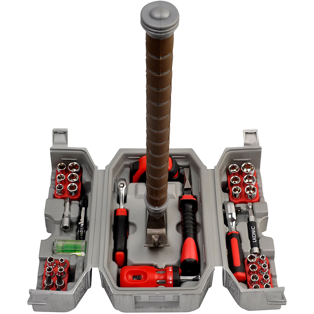 Assemble your own mighty team with the Marvel Avengers Thor Hammer Tool Kit! This comprehensive 44-piece set, housed within a durable Mjolnir-shaped case, provides all the essential tools for tackling home repairs and DIY projects with ease. Each tool is crafted for both precision and longevity, making this kit a practical addition to any toolbox. A striking collectible, it',s the perfect gift for any Marvel enthusiast (18+ to purchase.