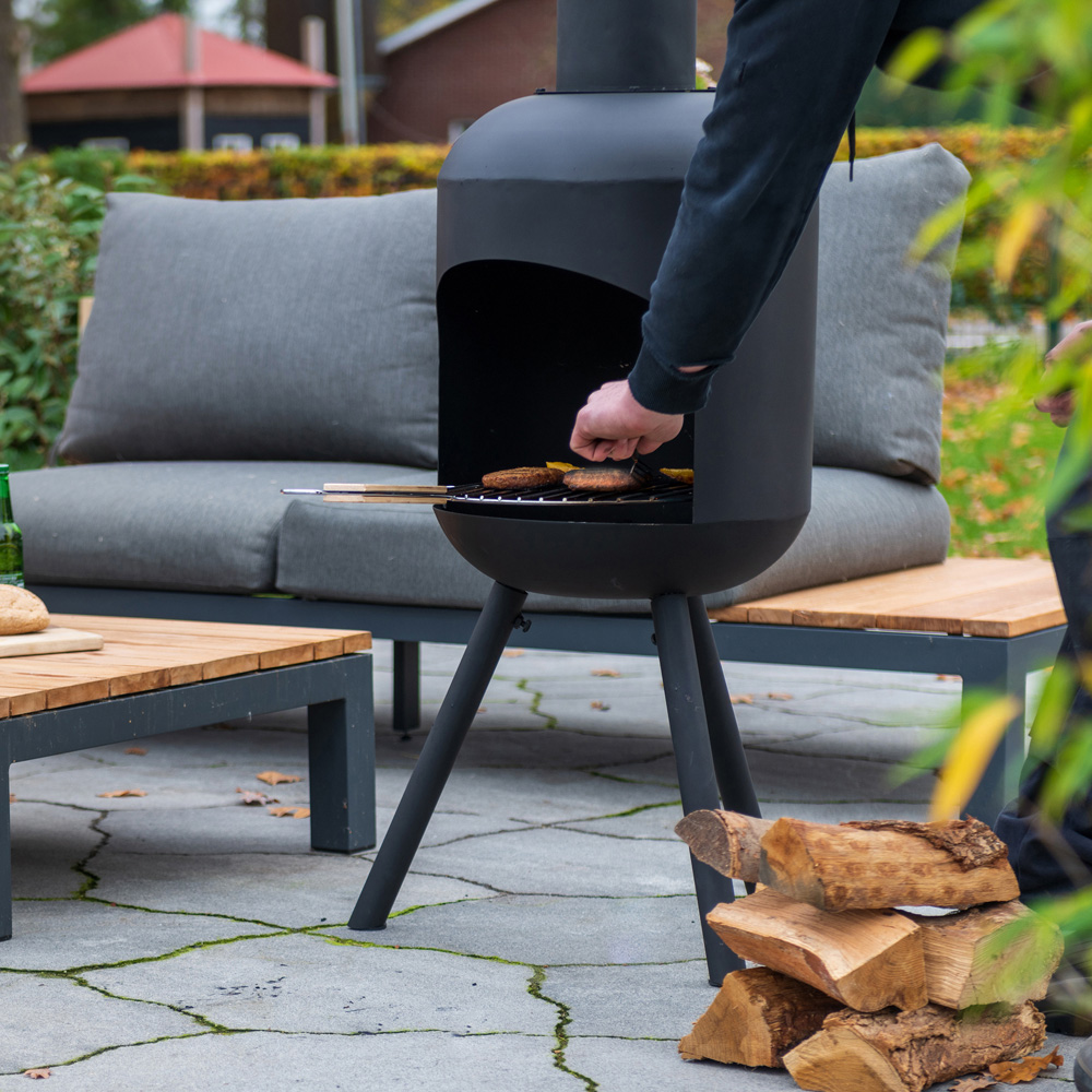 The Fuego Large patio fireplace offers a timeless, modern look to enhance your outdoor space. This durable chimenea is constructed from steel with a high-temperature resistant matte black finish. Its large size allows for burning larger pieces of wood, generating significant heat ideal for larger areas. More than just a fireplace, the Fuego Large includes a grill (approx. 40cm diameter) with a long handle for safe and easy grilling of various foods. Assembly is straightforward: simply attach the chimney and three sturdy legs for a stable base. The efficient chimney vents smoke neatly, complementing its stylish design. For longevity, clean the frame, lid, and bottom plate after cooling; proper storage will also help prevent rust. Enjoy warmth and delicious grilled meals – creating perfect evenings outdoors.