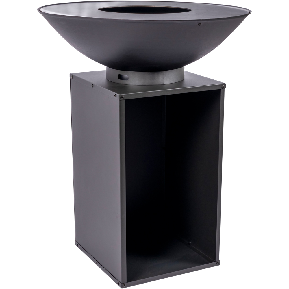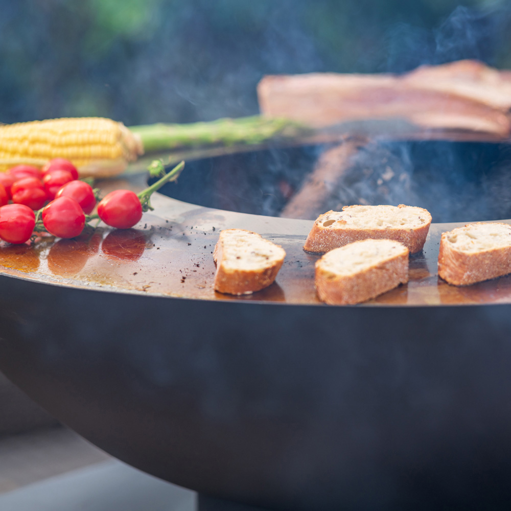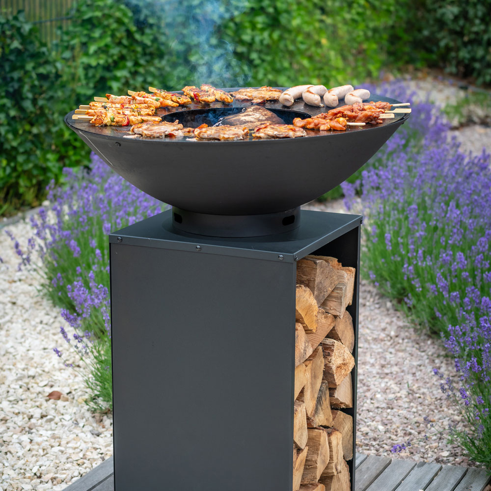 Enhance your outdoor gatherings with this stunning conical fire bowl and plancha grill. Crafted from sustainable, high-quality steel (1.8mm thick body, 4mm thick plancha ring), this spacious 80cm diameter firepit offers ample room for cooking delicious steaks, seafood, vegetables, and bread for friends and family. Its robust design easily accommodates large wood blocks, while the wood-fired grill radiates warmth for cosy winter evenings.
