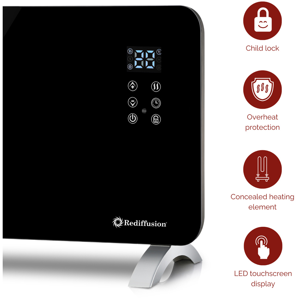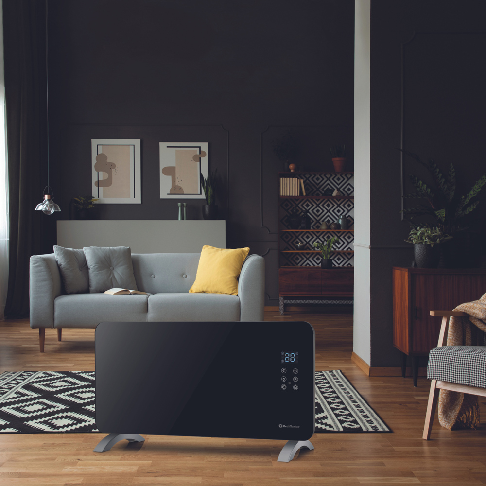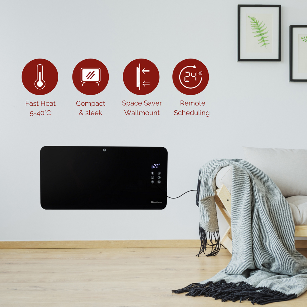 Experience effortless warmth with the 1500W Smart Glass Panel Heater. This powerful heater quickly warms rooms up to 20 square meters, combining smart technology with efficient heating. Wireless control via the user-friendly TUYA app lets you precisely set your temperature between 5-40°C. Enjoy flexible installation—wall-mounted or free-standing—to perfectly suit your space. The adjustable thermostat ensures optimal comfort, while the sleek tempered glass front and touchscreen control panel add a modern touch. Safety features include an IP24 waterproof rating, a child safety lock, and overheat protection. A convenient timer allows for automated shutoff after 1-24 hours. The aluminium heating element guarantees reliable and safe performance.